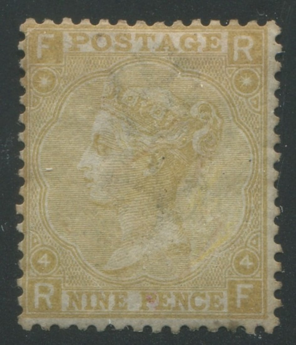 Great Britain 1867 #52 (SG #110), MH 9d Bistre (Straw), Scott value $2900, has a few nibbed perfs, strong and fine colour, appears f-vf (Image 1)