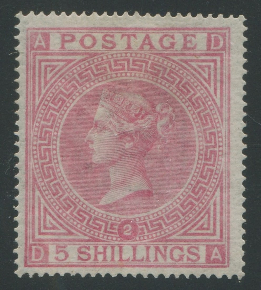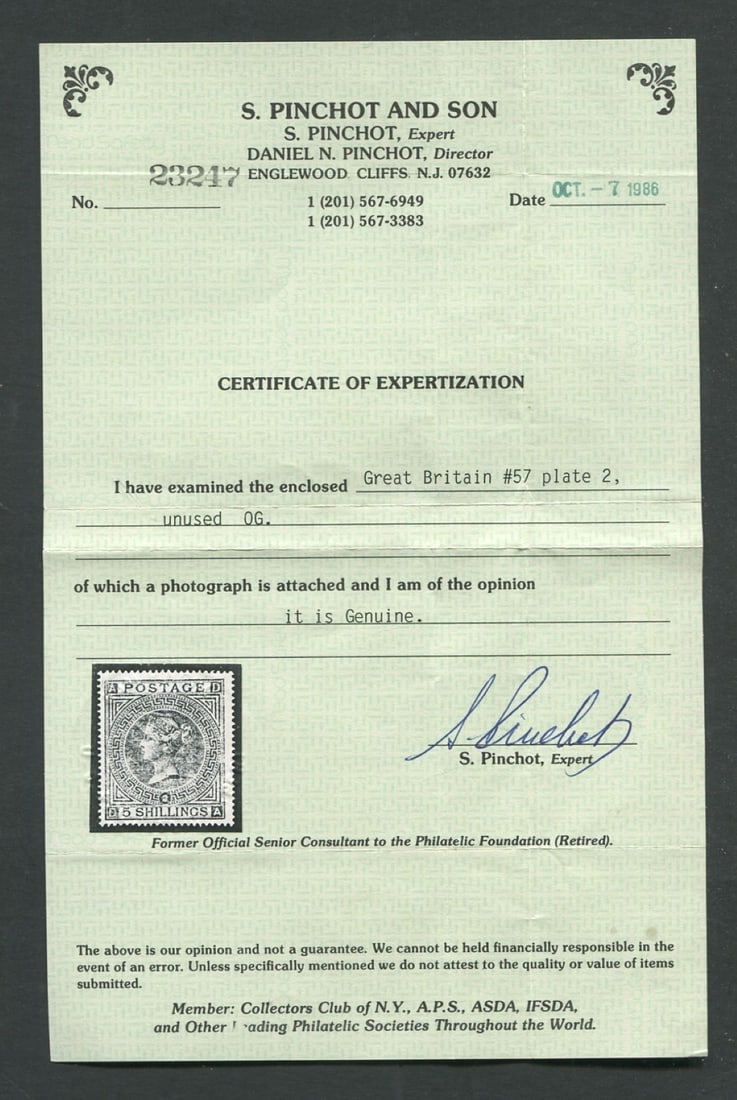 Great Britain 1867 #57, MH 5/- rose plate 2 (DA) Scott value $17500, has 1986 Pinchot cert, has some HR and possible perf repair to LL corner, appears f-vf (Image 1)