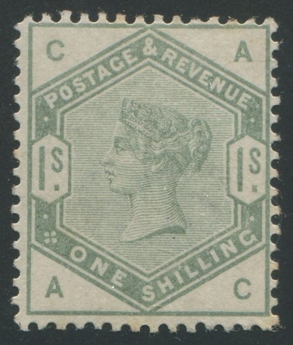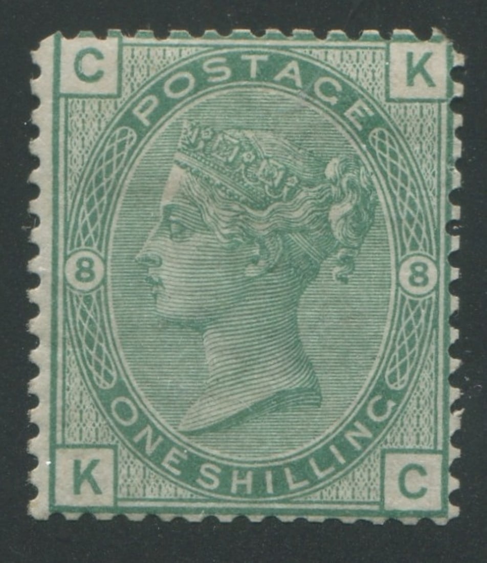 Great Britain 1873 #64a MH 1/- deep green plate 8 (KC), Scott value $1275, has HR a little off centre otherwise appears f-vf (Image