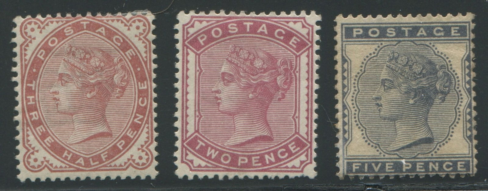 Great Britain 1880-1881 #80 / #85, MH group of three, 3 half pence red brown, 2d rose lilac and 5d dp indigo Scott value $1540, some HR and toning to 5d, otherwise f-vf (Image 1)