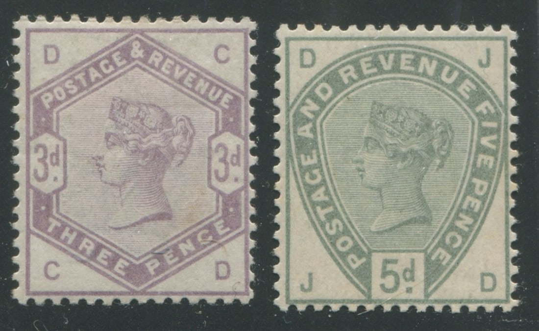Great Britain 1883 -1884 MH #102 3d lilac and #104 5d green, Scott value $1325, some light HR, appears f-vf (Image 1)