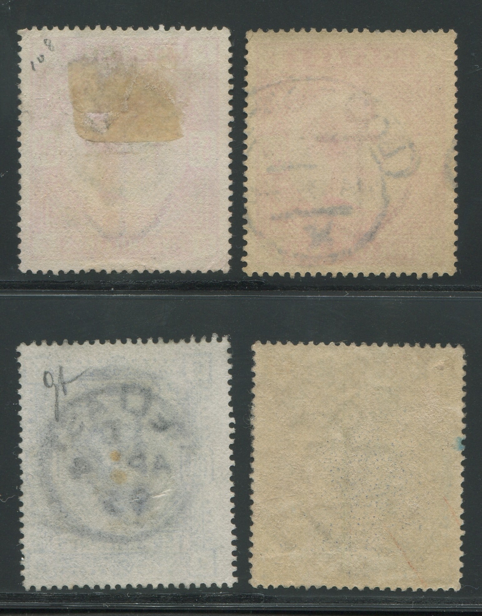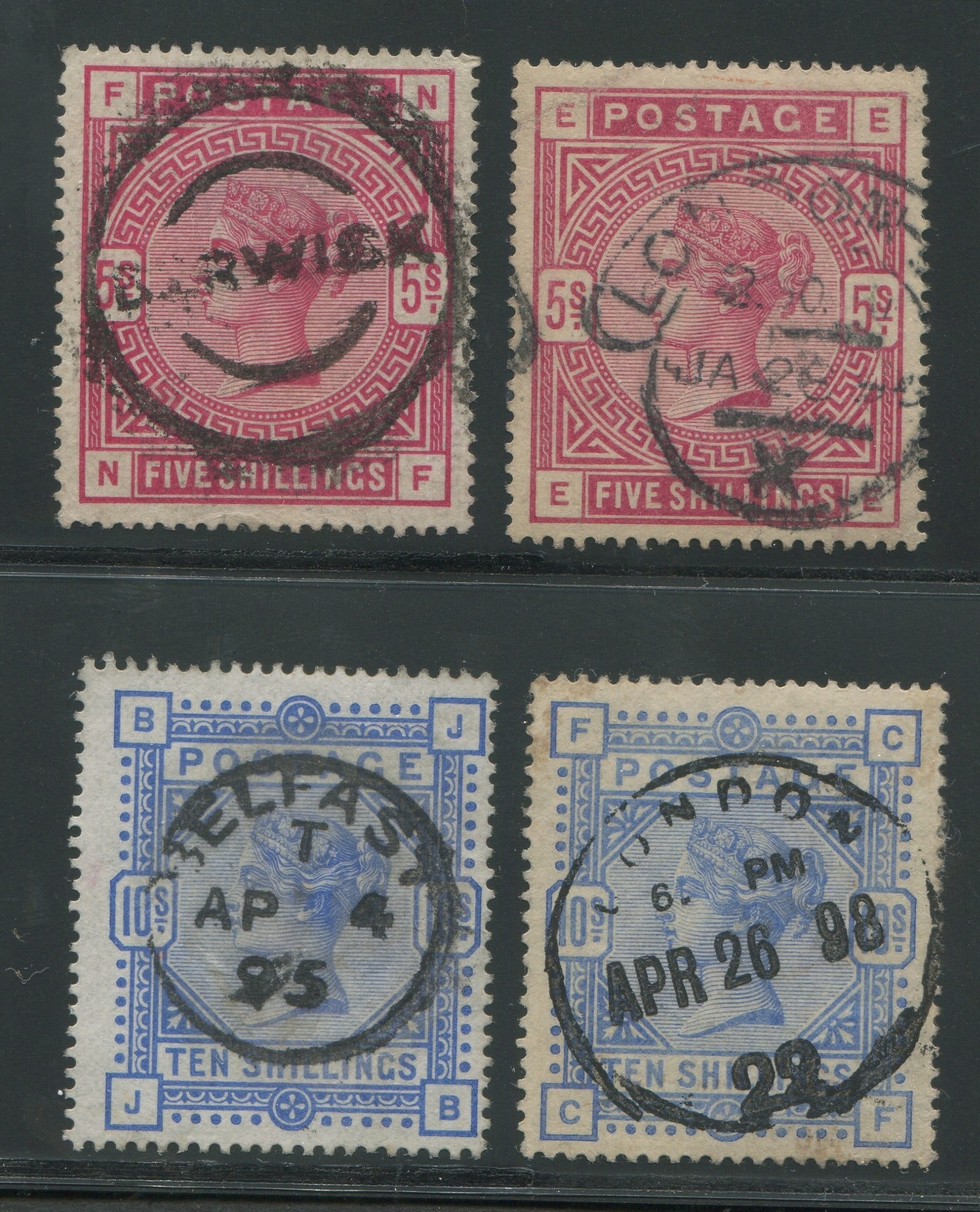 Great Britain 1884 #108 5/- (2) Carmine Rose and #109 10/- Ultramarine (2) used examples with shades, Scott value $1810, Appears f-vf (Image 1)
