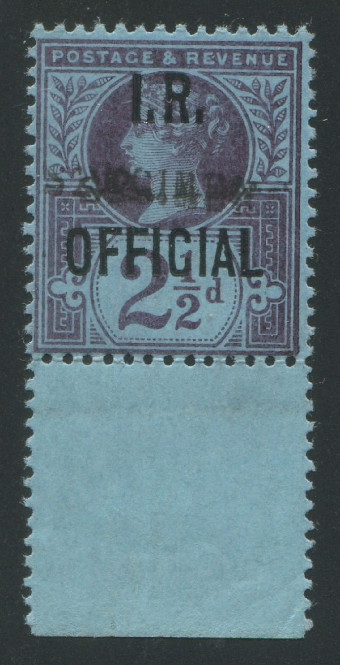 Great Britain - Officials 1891 #O14 2 1/2d violet and blue MNH bottom margin copy with black Specimen overprint which appears doubled (Kiss Print?) Specimens not listed in Scott, priced as regular stamp $200+ appears genuine,