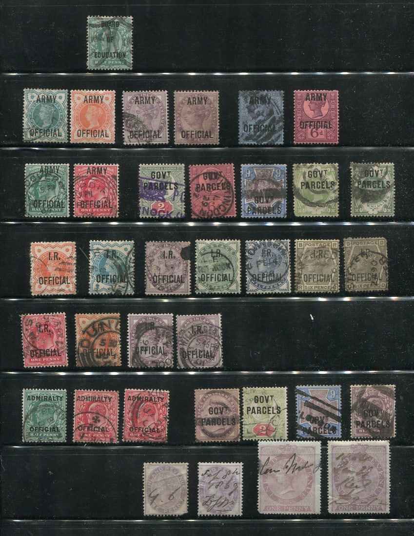 Great Britain - Officials 1882 - 1903 #O1 / #O73, a MH and used collection on stocksheet, includes I.R Officials, Army Officials, GOVt Parcels, Board of Education and Admiralty, Scott value $1617, appears genuine, but no