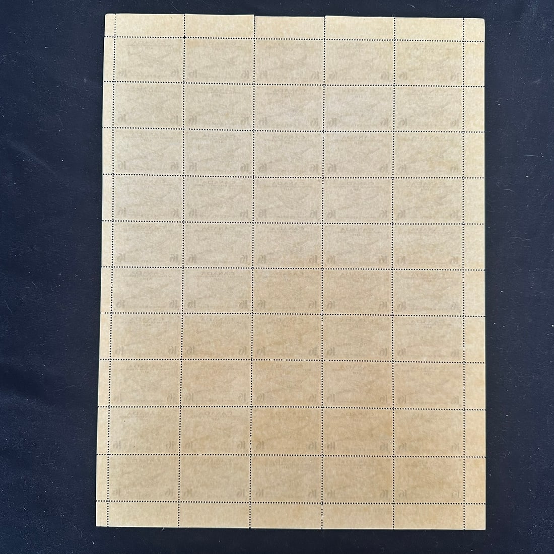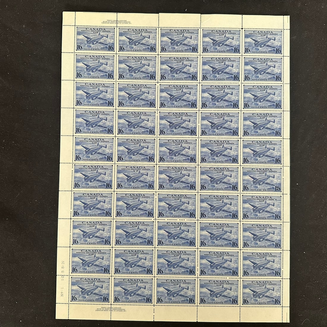 Canada, Airmail Special Delivery CE1 complete sheet of 50 VF NH, with Plate 1 imprints upper left and lower left, cutting guidelines UL, UR, LR, Unitrade $183.00, $130.00 USD, slight perf separation upper selvage, otherwise