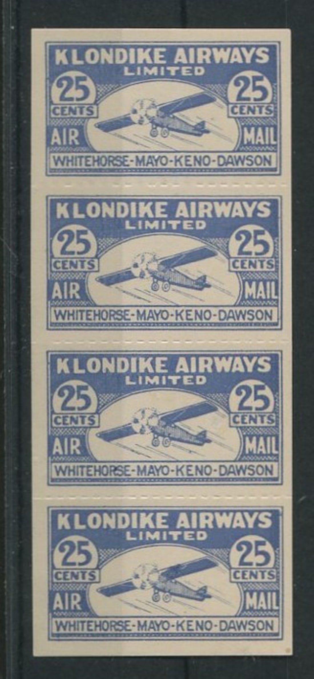 Canada - Semi Official Airmail 1928 #CL 25, a MNH complete pane of four (top stamp MH) of the 25c Klondike Airways semi postal Unitrade value $472.50 CND ($350 USD), appears f-vf (Image 1)