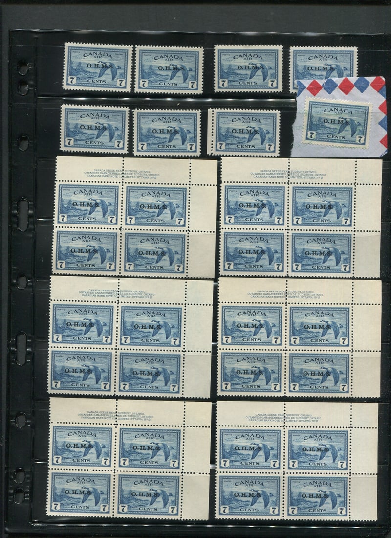 Canada 1949 - 1950 O.H.M.S.# CO 17c Canada Goose. a MNH / MH and used group of singles (8) and" Canada 1949 - 1950 O.H.M.S.# CO 1 7c Canada Goose a MNH / MH and used group of singles (8) and plate blocks UR plate 2 (6)