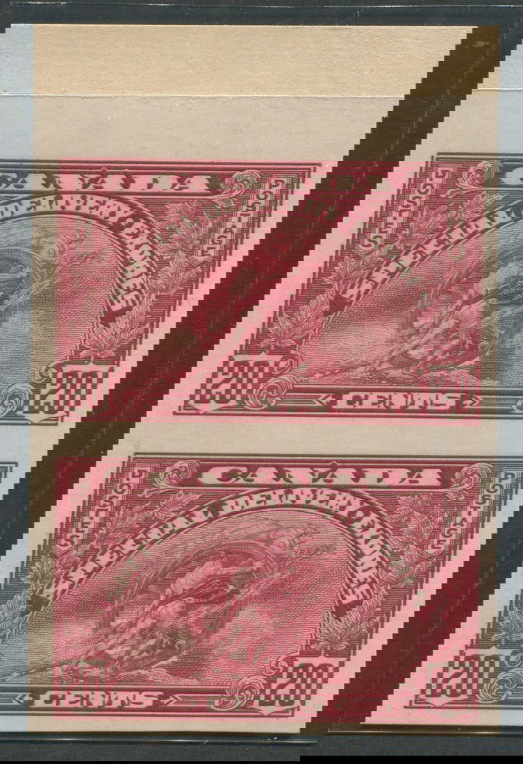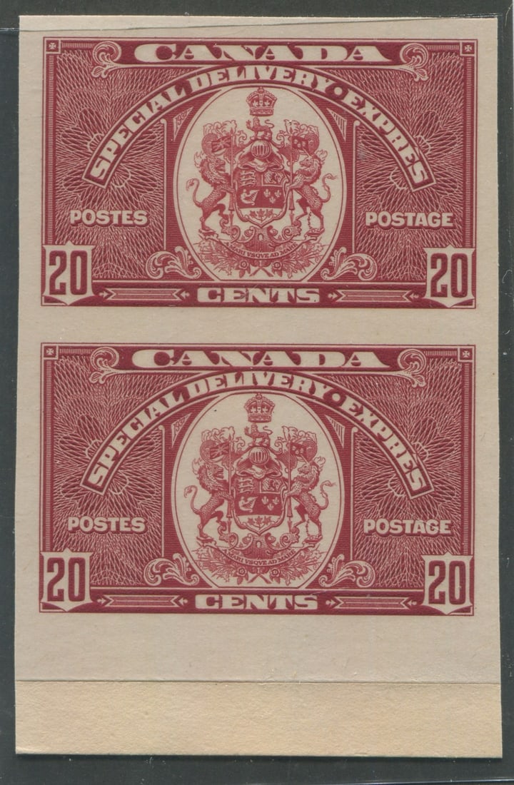 Canada 1938, E8P, proof of the Special Delivery Stamp, India paper on card, Unitrade Cat. $700.00, USD $490.00, vertical pairwith large bottom margin. (Image 1)