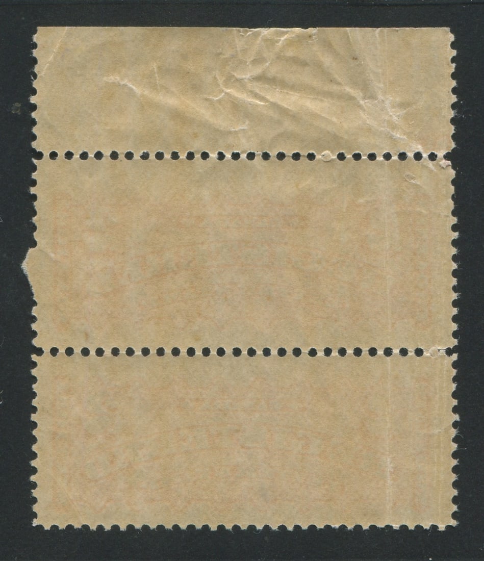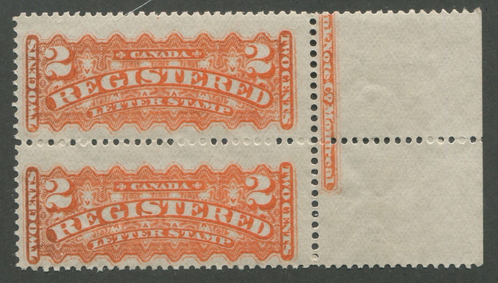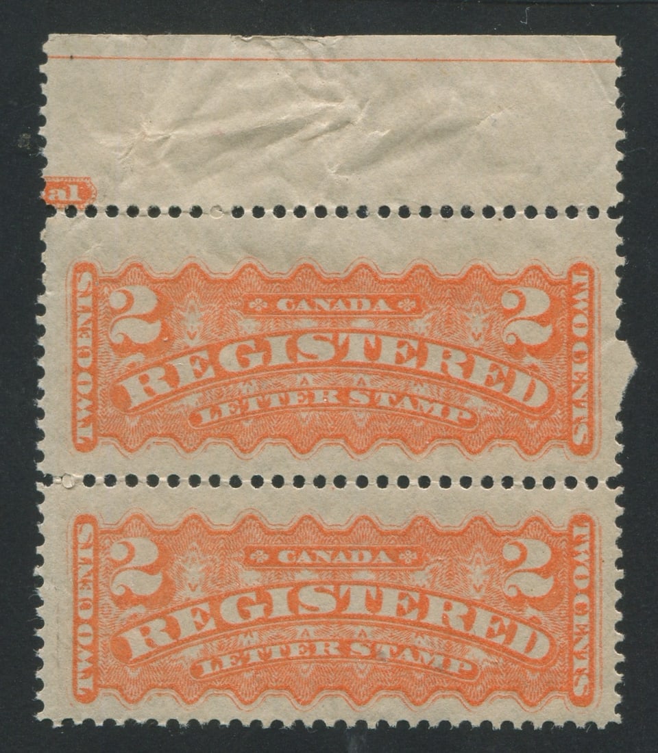Canada - Registration Stamps 1875 - 1896 #F1, MNH 2c orange vertical pair with top margin, Unitrade value $900 CND ($642.85 USD), has a vertical crease and few blind perfs, appears f-vf (Image 1)