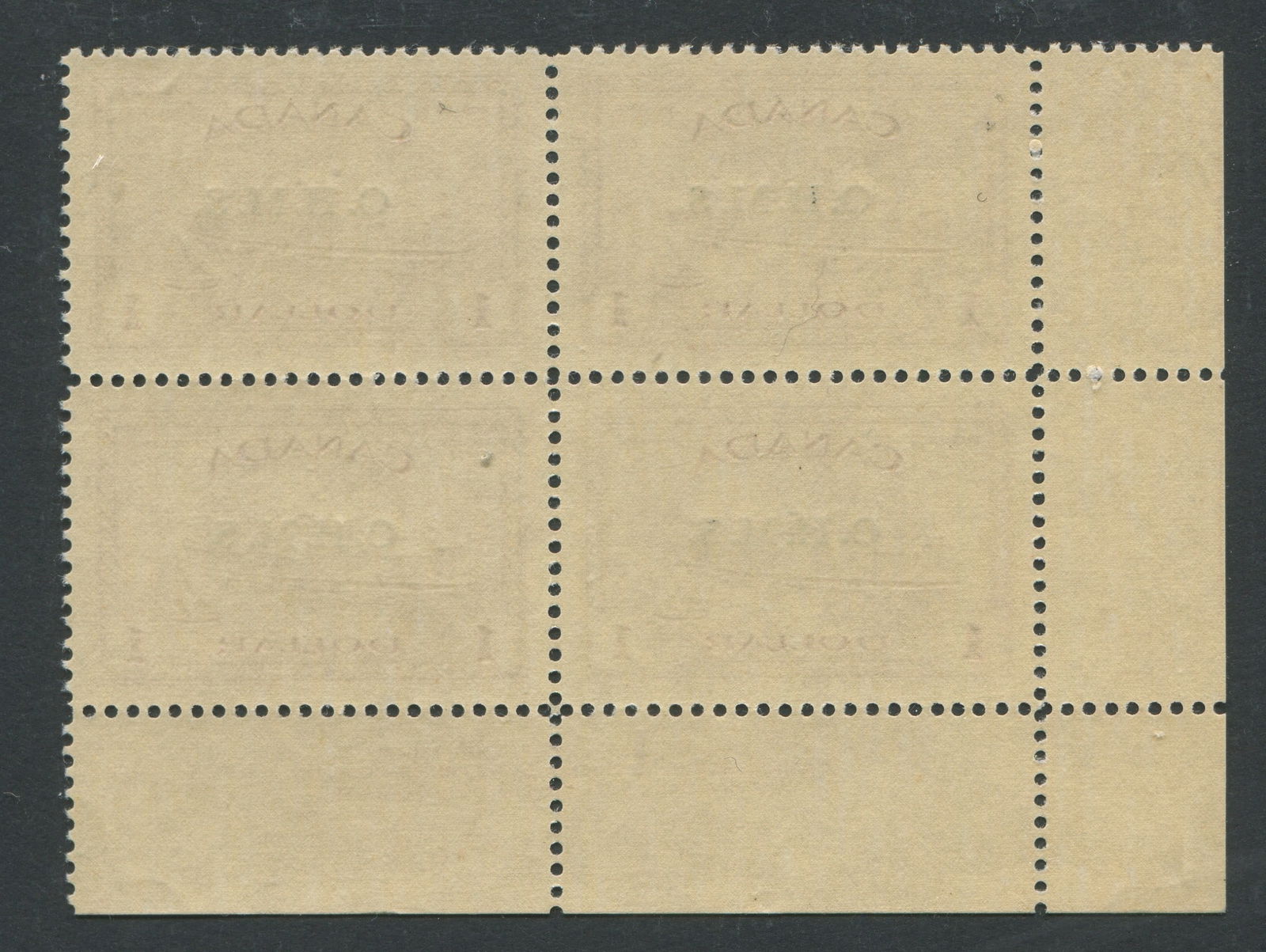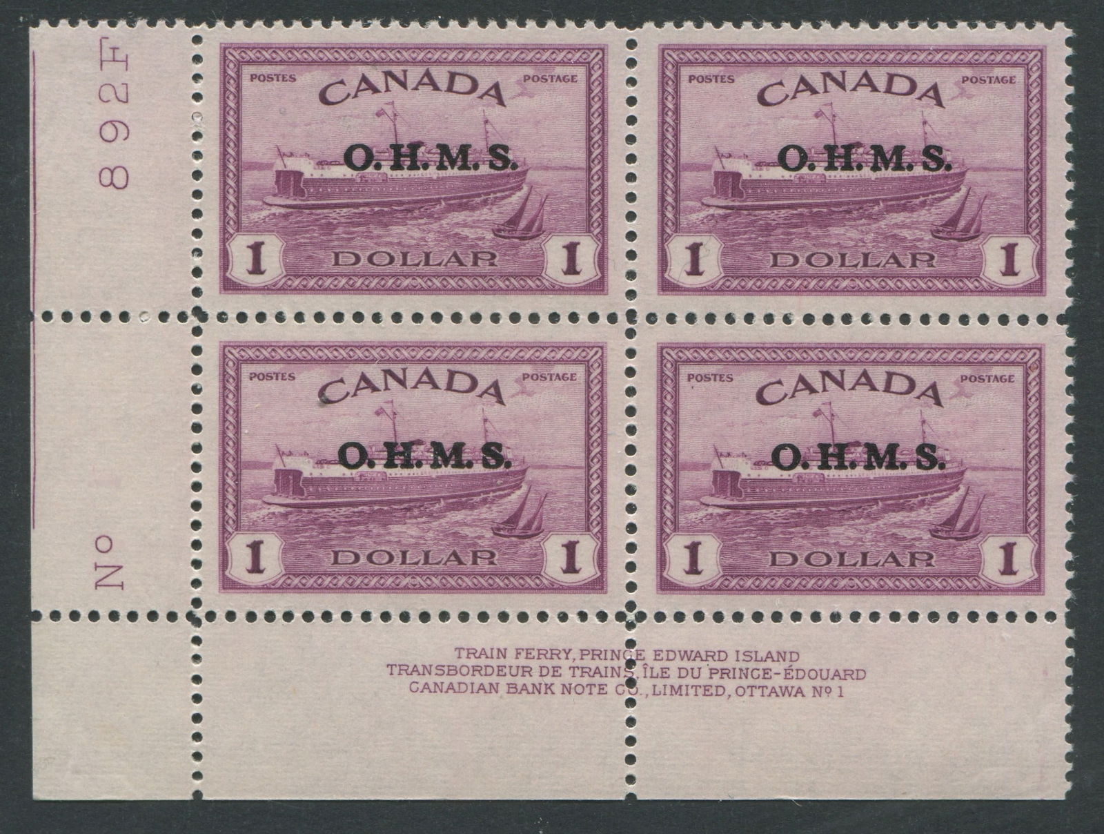 Canada 1949 -1950 #O10 $1 Train Ferry MNH LL plate block No 1, Unitrade Value $540 CND ($385 USD), appears f-vf (Image 1)