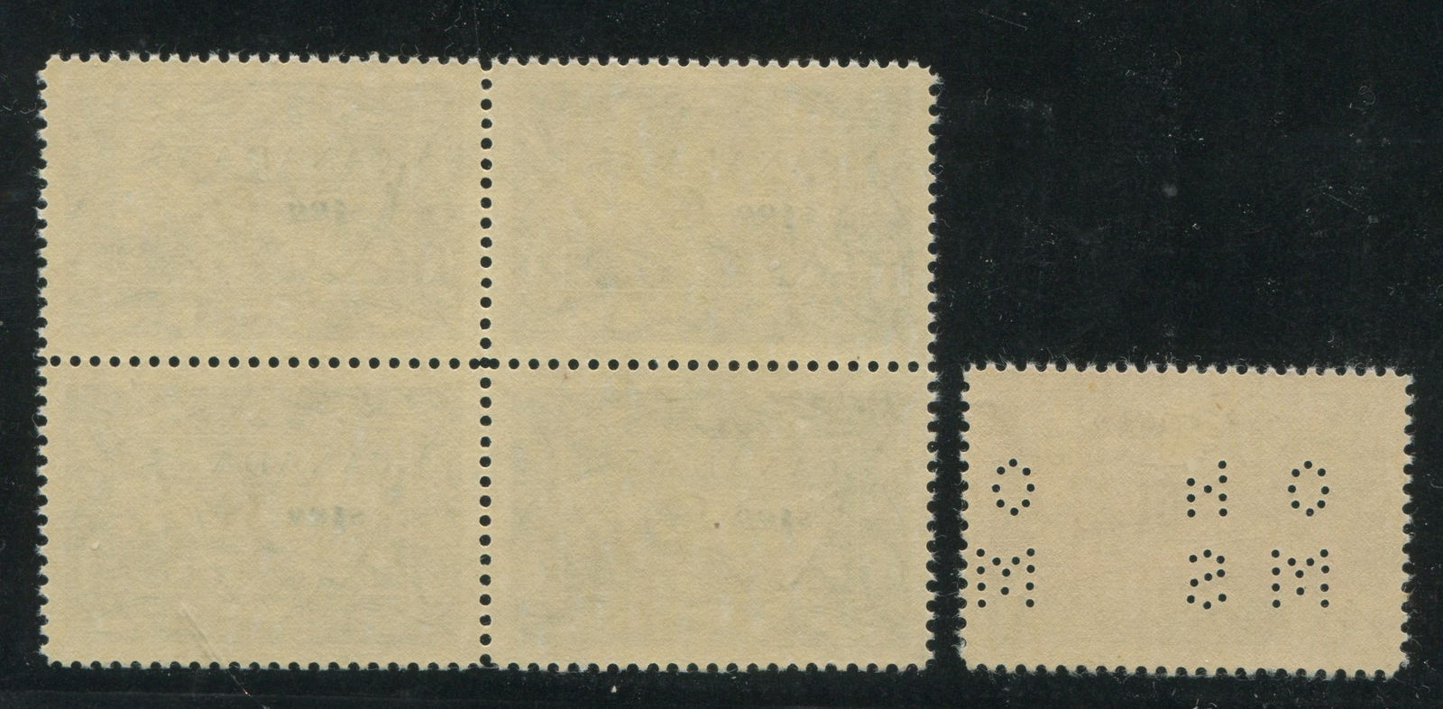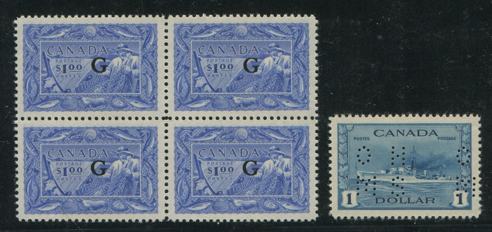 Canada 1942 - 1950 #O10 -262 $1 destroyer MLH and O27 $1 bright ultramarine fisherman blockof four MNH, Unitrade value $740 CND ($528.57 USD), appears f-vf (Image 1)