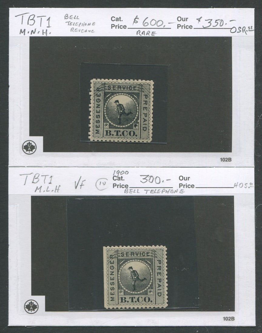 Canada 1900 #TBT1 Bell telephone Prepaid Messenger Stamps MNH and MLH. This lot consists of 2 Bell telephone Revenue Prepaid Messenger Stamps, i being MNH and the other MLH, both rare. Estimate $900 Cnd. (Image 1)