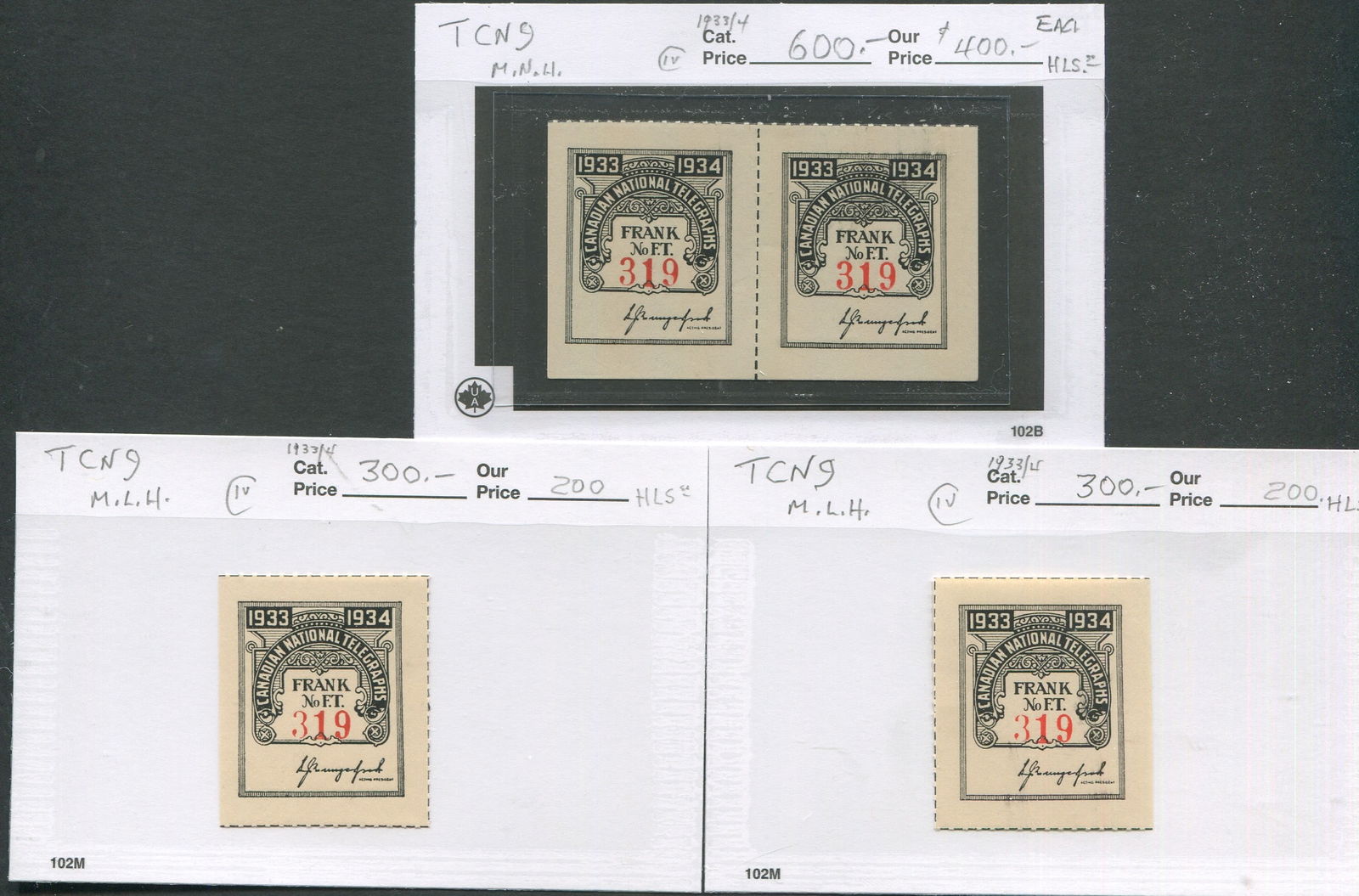 Canada 1933-1934 #TCN9 Canadian National Telegraphs Revenue Stamps MNH and MLH. This lot consists of 4 revenue Canadian National Telegraphs stamps all 1933/34. Cat value $1,800 Cnd. (Image 1)