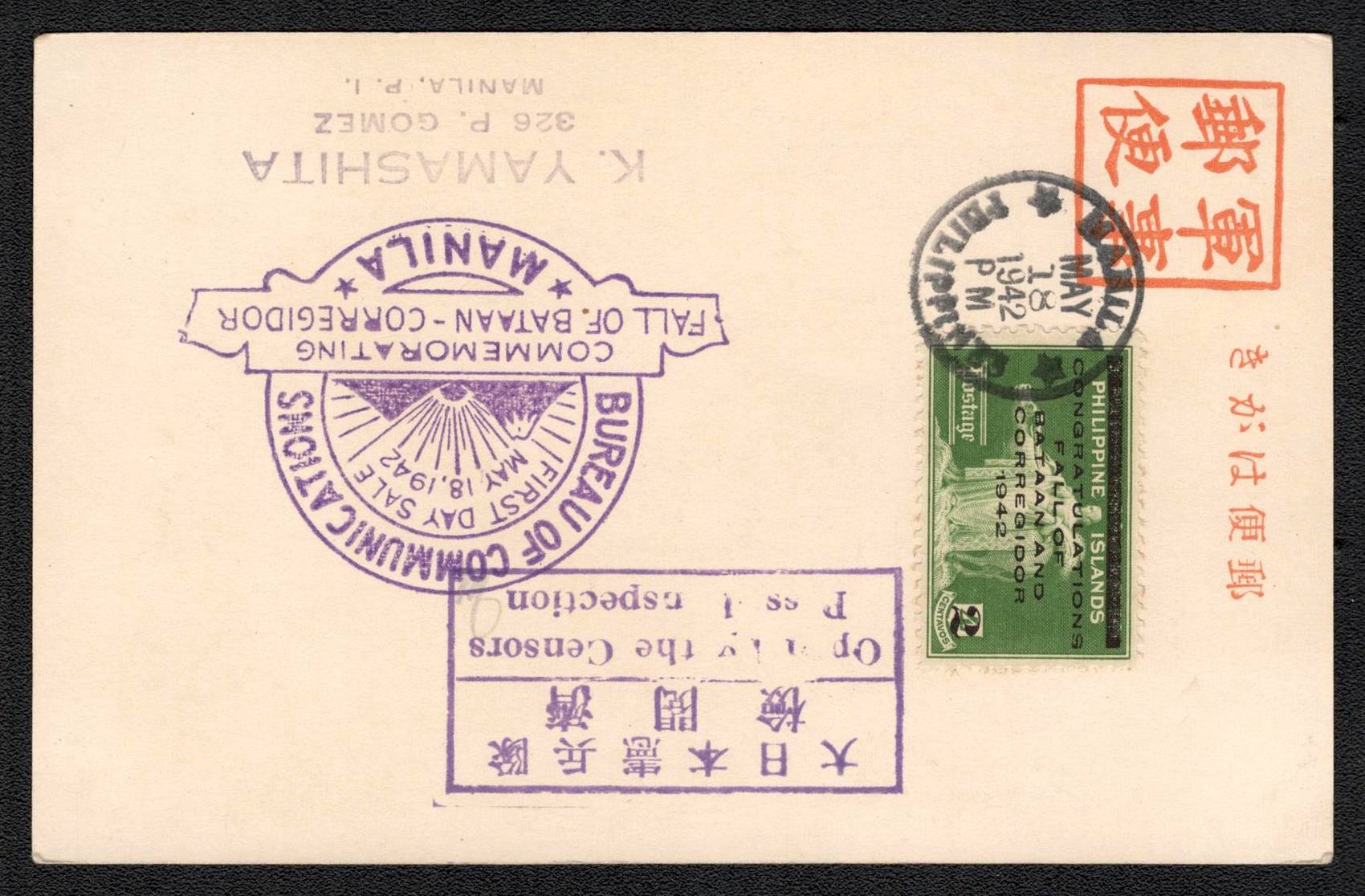 475 image1942 (18 May) Philippines, Japan Occupation, WWII, Military Mail Censored First Day Postcard locally addressed in Manila, franked with 2c on 4c, with 'Bureau of Communications, Manila, Commemorating Fall of Bataan - Corregidor' Handstamp, Michel 8, (Image 1) (Image 2)