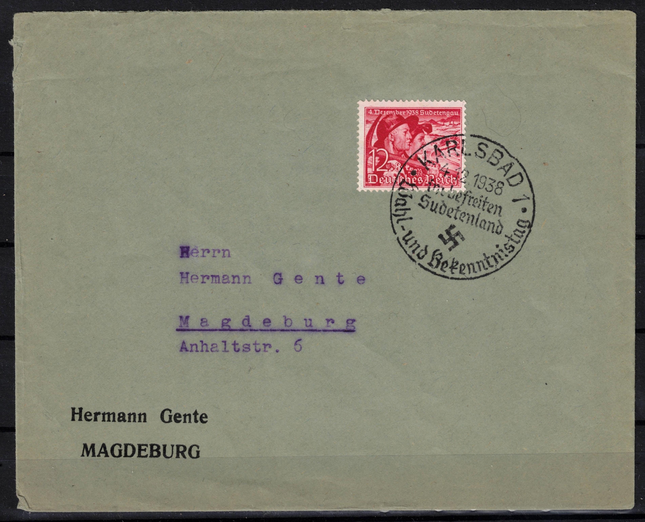 1321 Used image1938 (4 Dec) Third Reich, Germany, Cover to Magdeburg franked with 12+8pf tied by rare Propaganda-Cancellation 'Karlsbad Sudetenland 'Election and Liberation Day' (Unpriced), Michel 685, (Image 1) (Image 2)