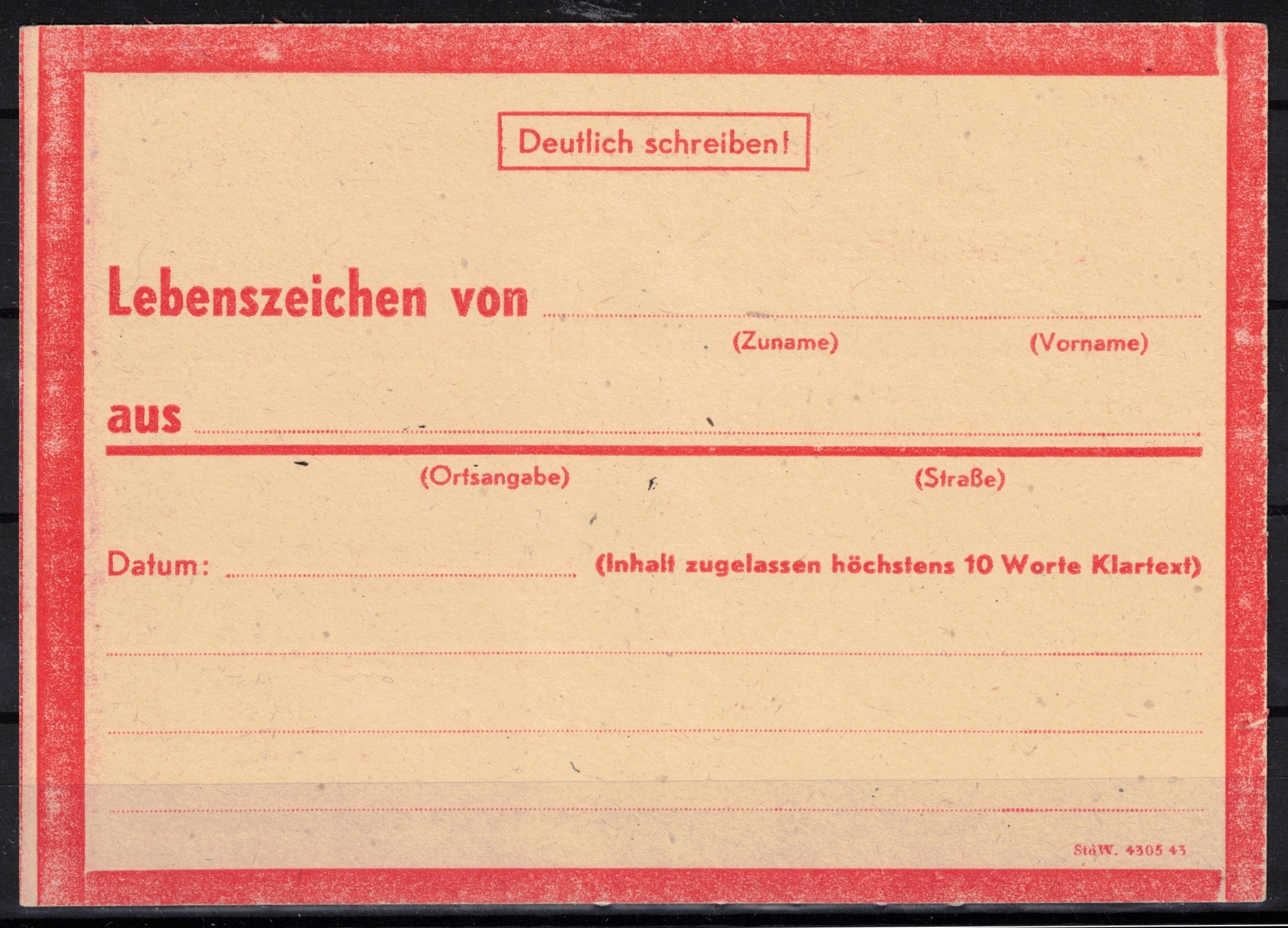 1305 Mint imageThird Reich, Germany, Field post, Red Mint Red Cover of Express Preworded Post Card Form (to provide a soldier with urgent family information i. e.. 'all alive after heavy bombing', Plate-Nr Std. W. 4305 43), Michel 21 red, Catalog value $30 (Image 1) (Image 2)