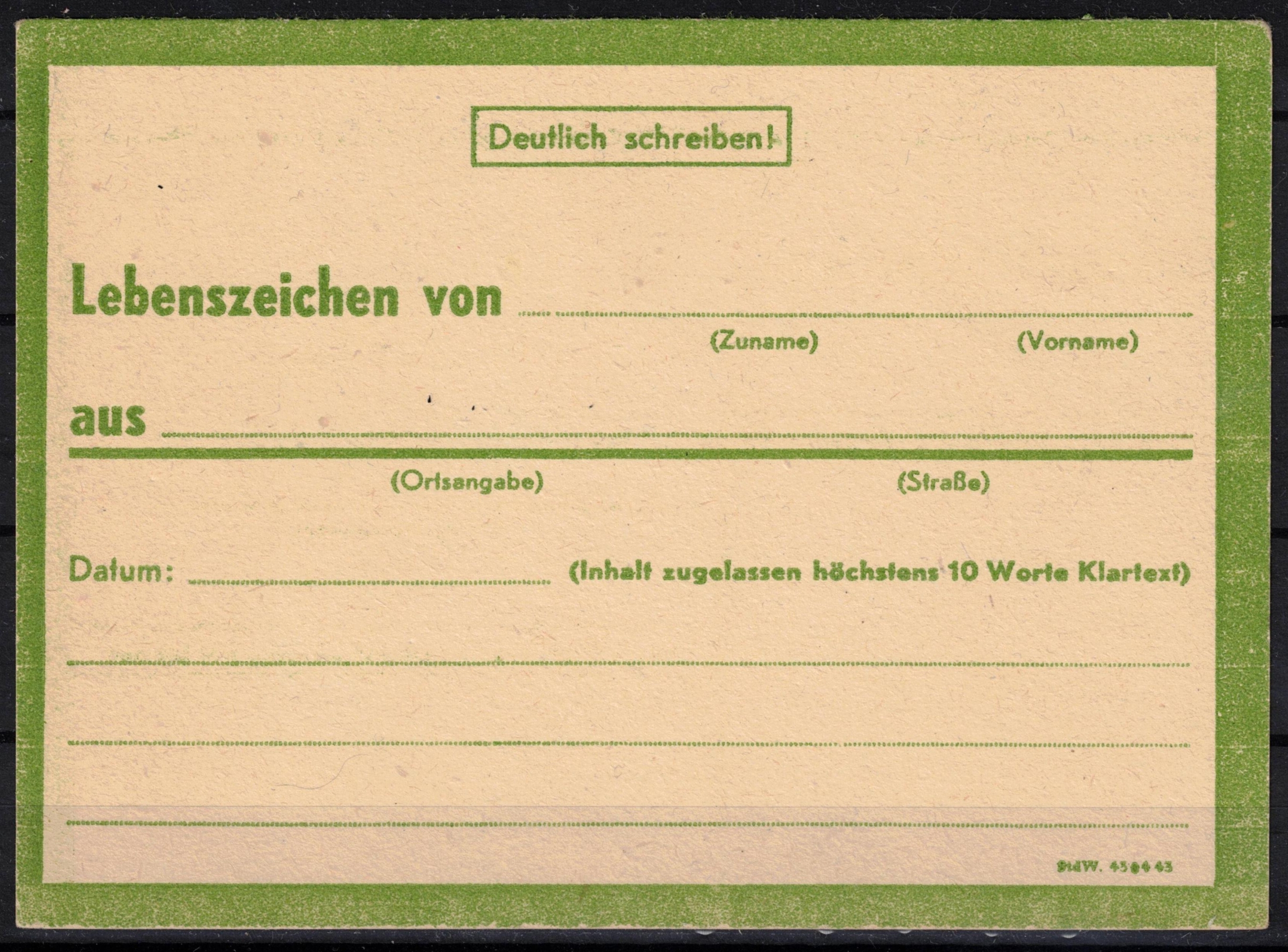1306 Mint imageThird Reich, Germany, Field post, Green Cover of Express Preworded Post Card Form (to provide a soldier with urgent familiy information information i.e.. 'all alive after heavy bombing', Plate-Nr Std. W. 4304 43), Michel 21 green, Catalog value $25 (Image 1) (Image 2)