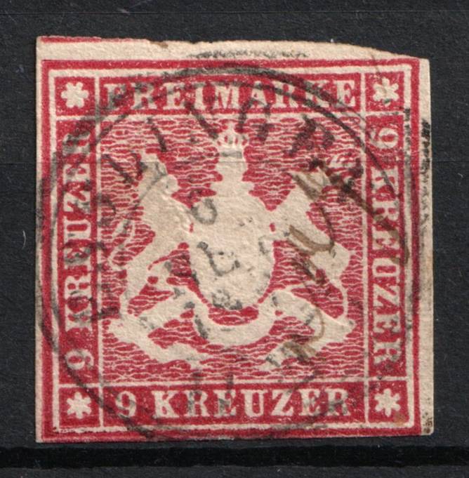 1384 Used image1859 9kr, German States, Wurtemburg, Germany (Double Signed), Michel 14b, Catalog value $1140 (Image 1) (Image 2)