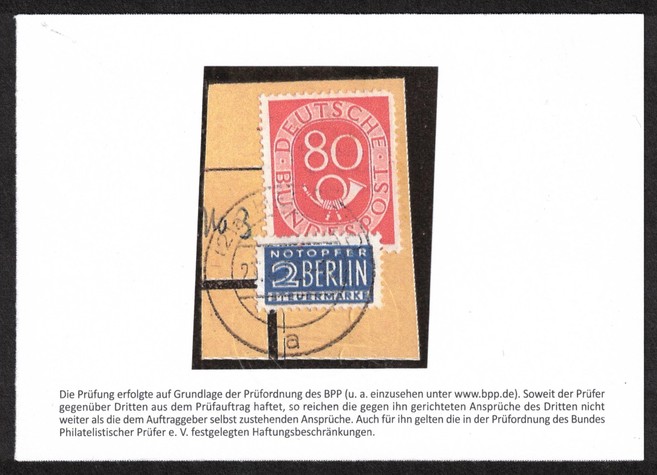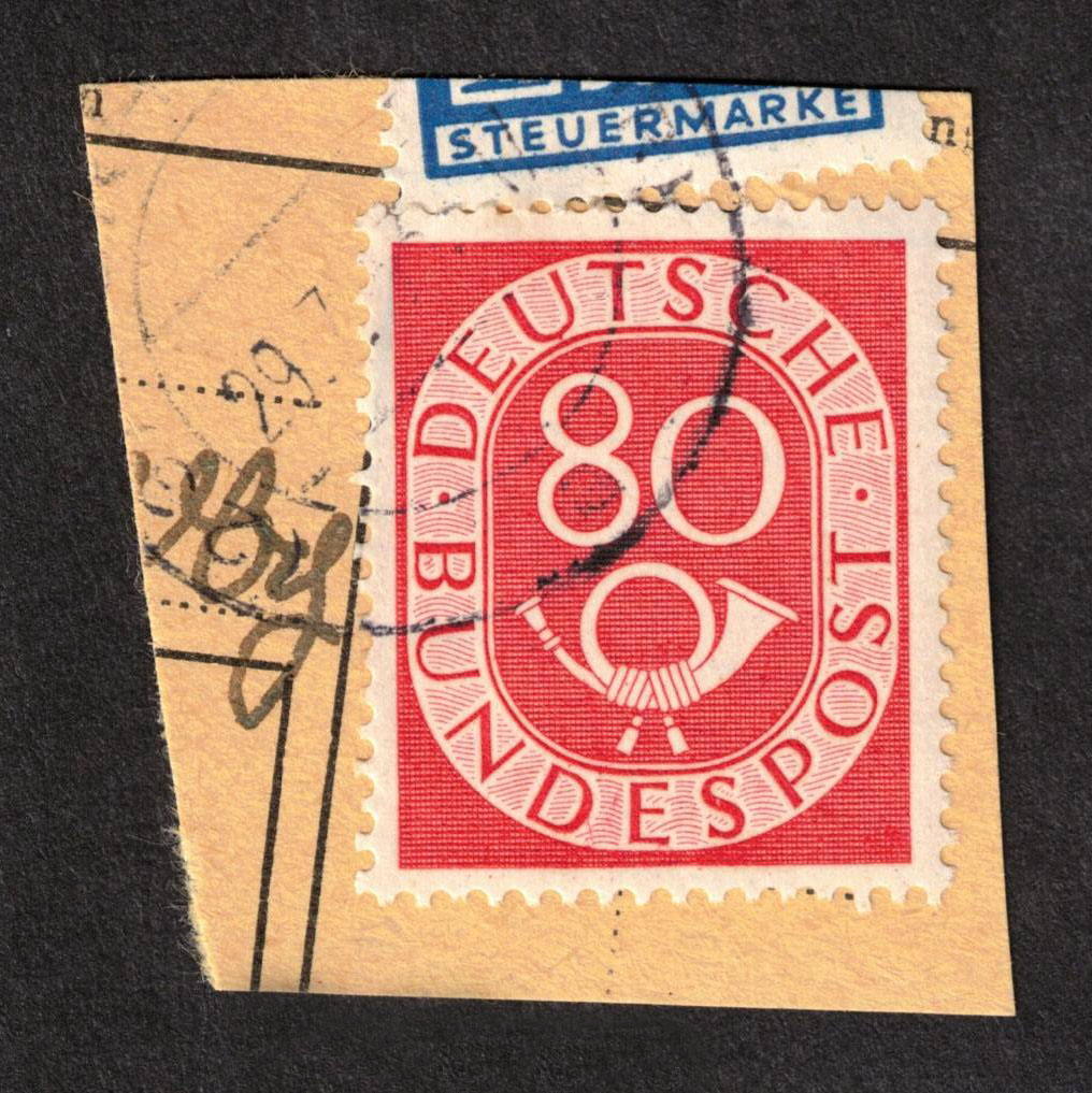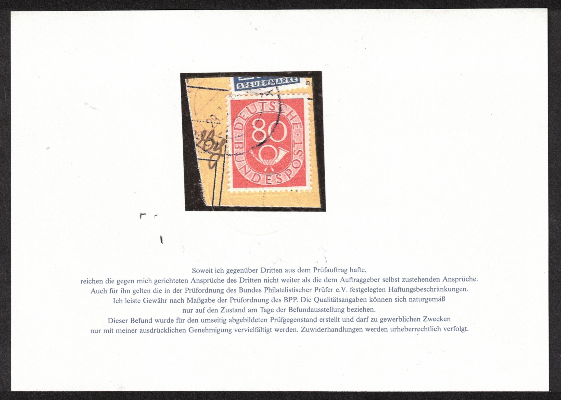 2183 Used image1952 80pf on cover piece, German Federal Republic, Germany (Lines in Oval above 'B', Current Certificate Schlegel, RARE), Michel 137 PF III, Catalog value $950 (Image 1) (Image 2) (Image 3)
