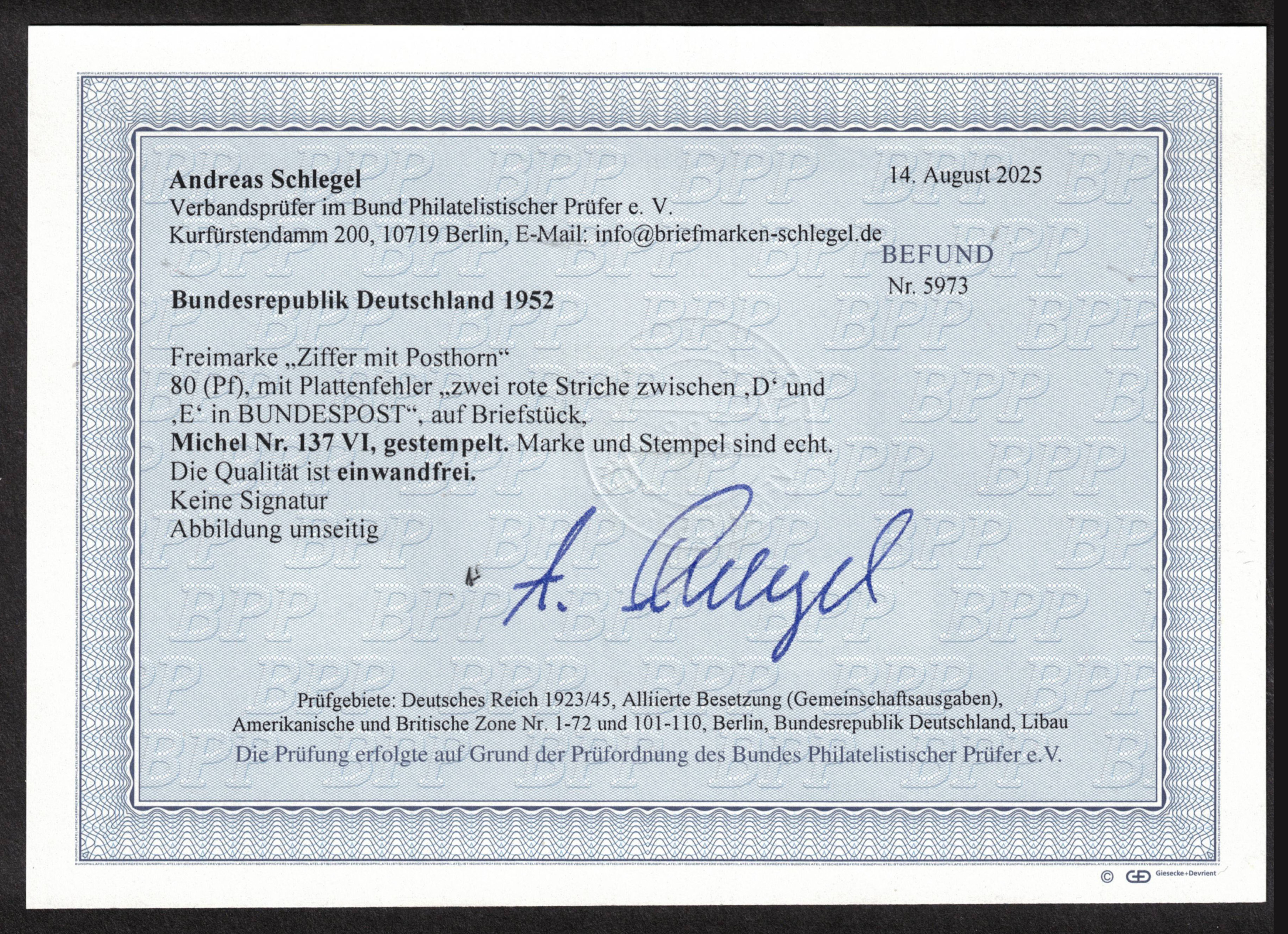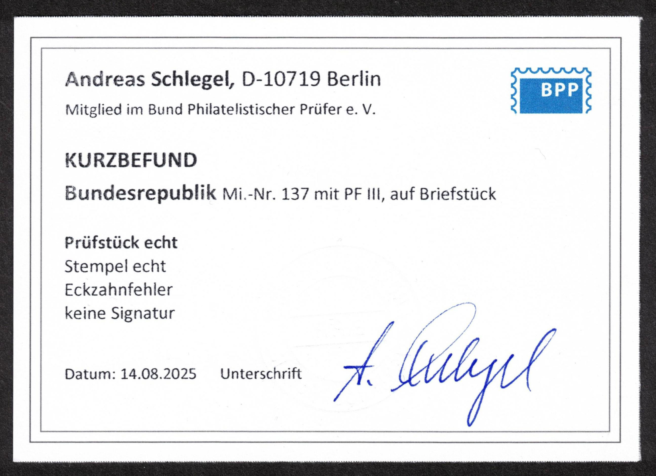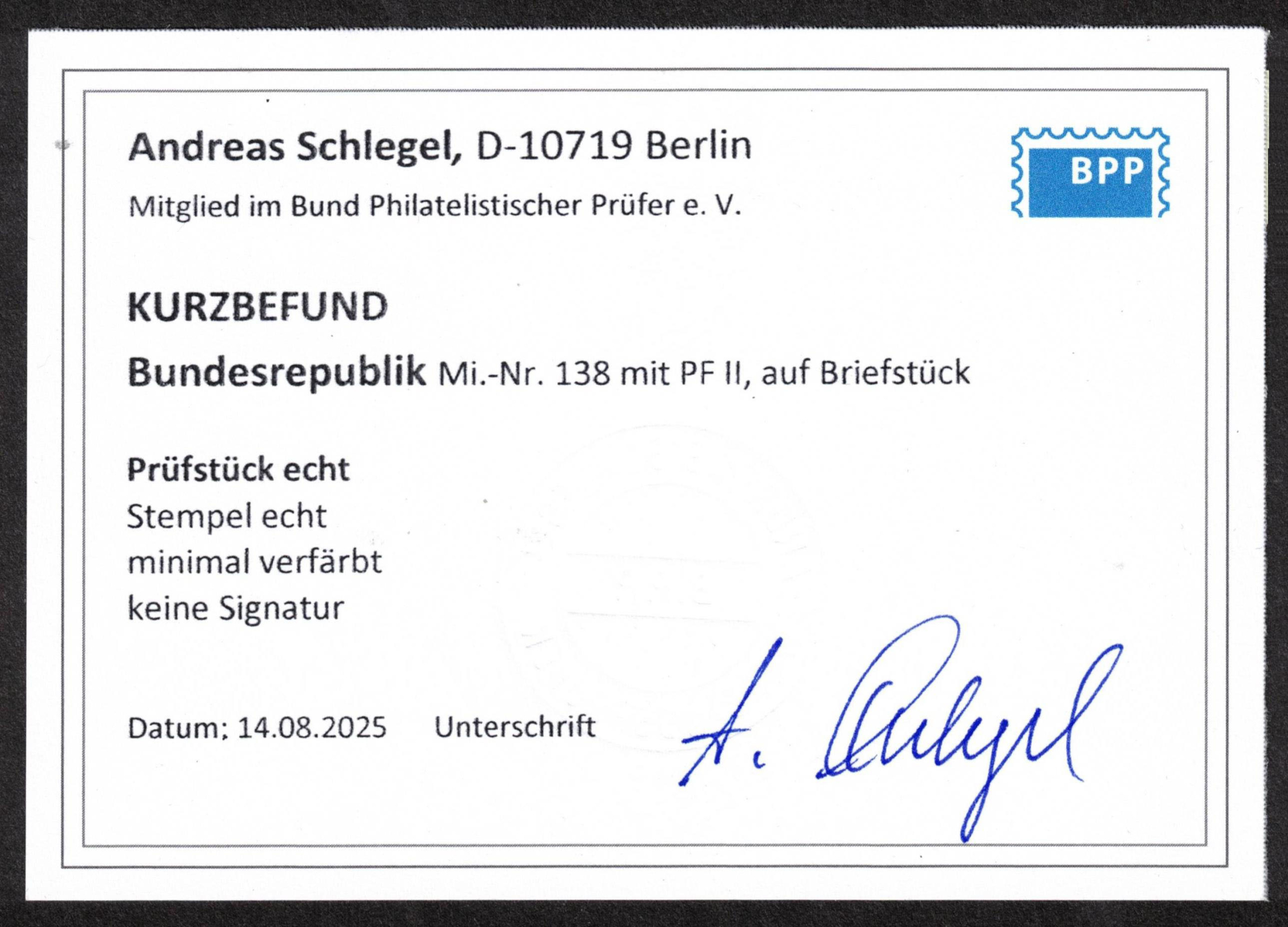 2183 Used image1952 80pf on cover piece, German Federal Republic, Germany (Lines in Oval above 'B', Current Certificate Schlegel, RARE), Michel 137 PF III, Catalog value $950 (Image 1) (Image 2) (Image 3)