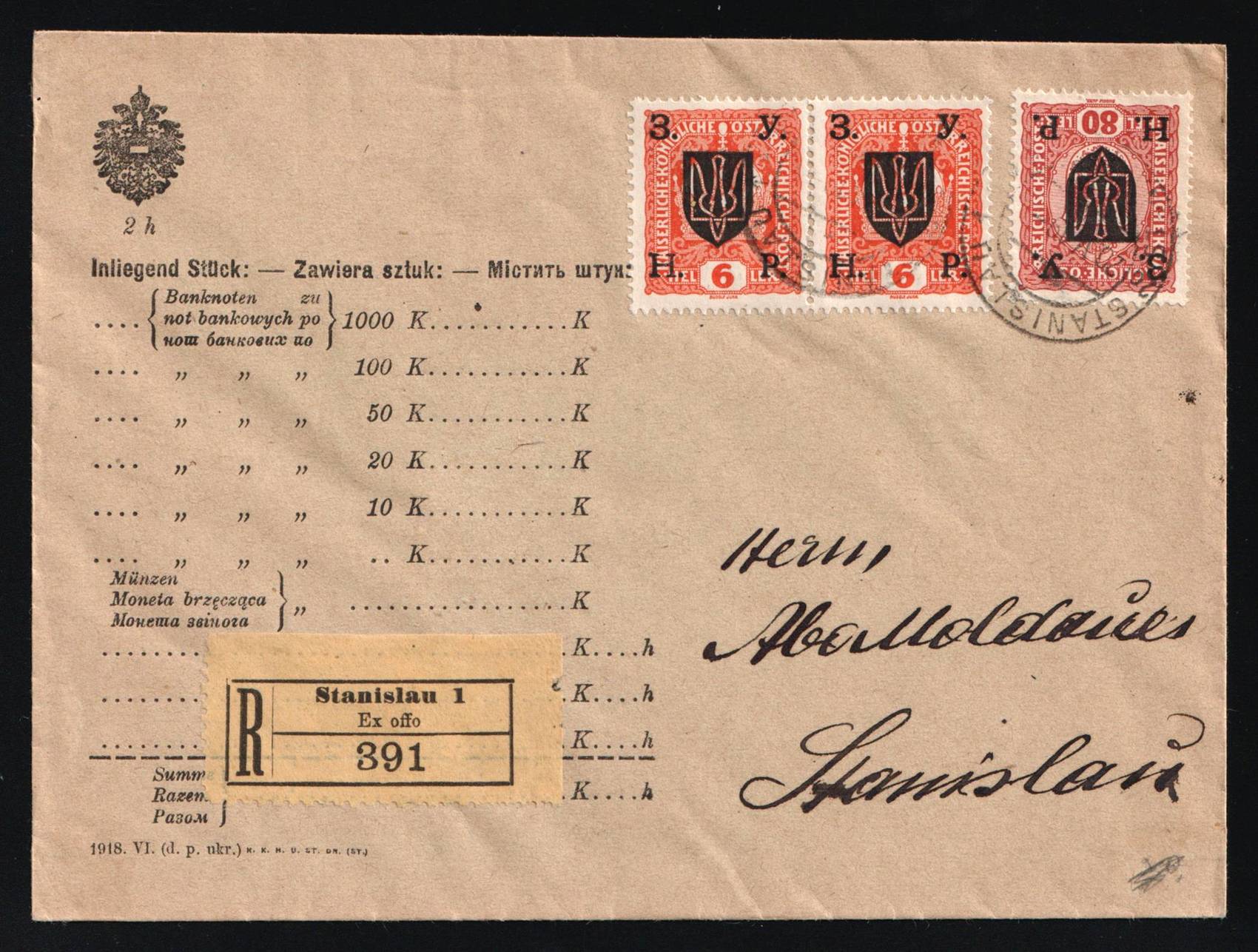 3157 image1919? WESTERN UKRAINE REPUBLIC Cover of registered letter sent in Stanislau locally. Franked overprinted Austrian stamps for 92 heller. Cancellation of Stanislau (Image 1) (Image 2)