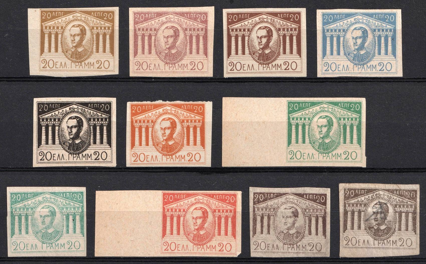 556 No image1893 Greece, 20 Lepta Unlisted 11 Different Essay Trial Color Proofs Unissued. No gum (*), 1st in the 3rd row with a small thin spot.