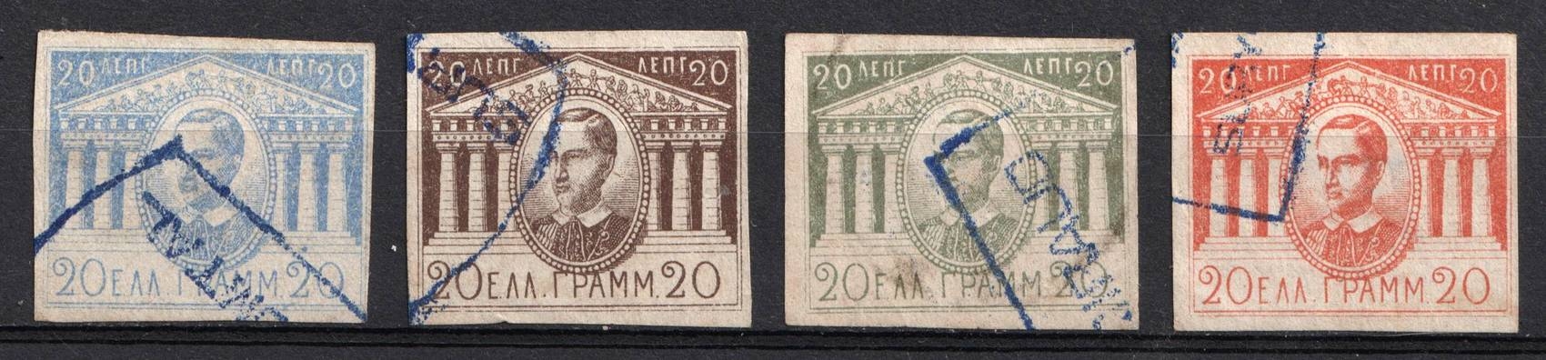557 Used image1893 Greece, 20 Lepta Unlisted 4 Different Essay Trial Color Proofs Unissued. Used, 3rd with a small thin spot. (Image 1)