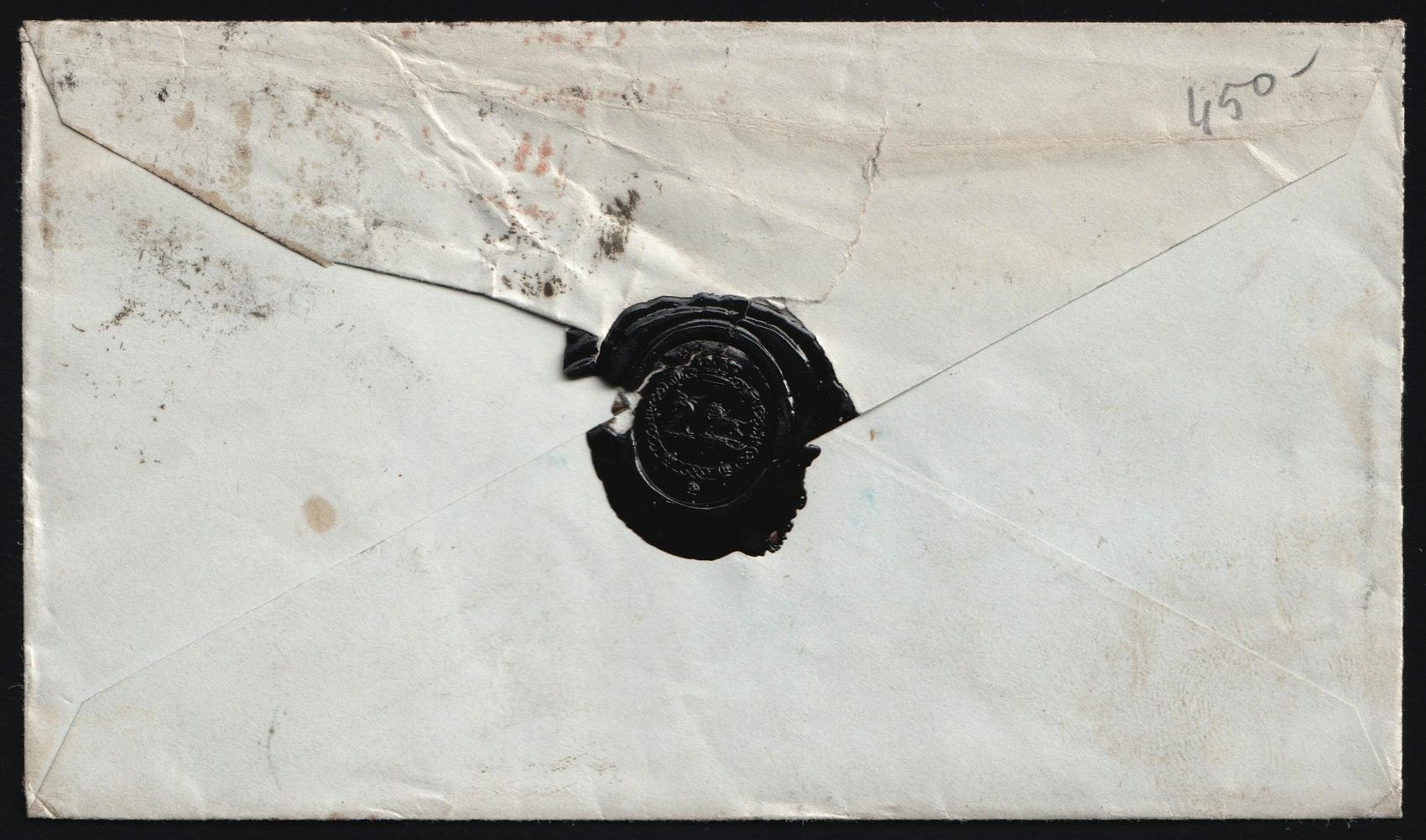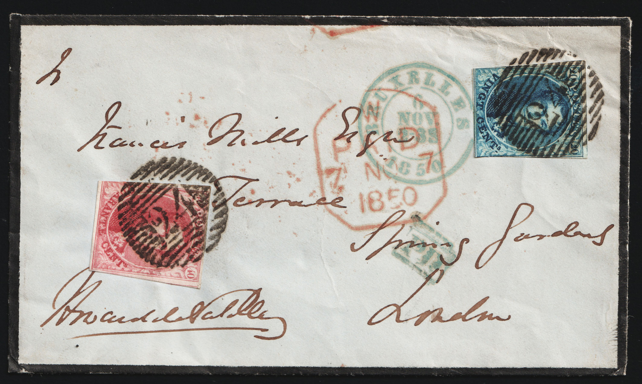 1587 image1850 (6 Nov) Belgium, Mourning Cover from Bruxelles (Belgium) to London (England), franked with 20c and 40c and tied by Circular Numeral '24' Postmark, with Black Wax Seal on the Reverse, with Green and Orange 'Paid' Handstamp's. Tears and light creases. (Image 1) (Image 2)
