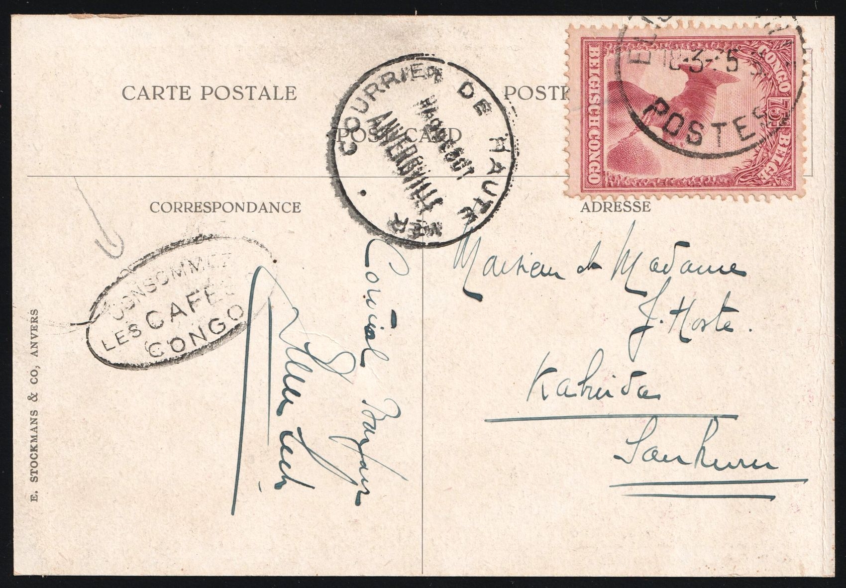 1610 image1953 (18 Mar) Belgian Congo, Belgian Colonies, Postcard from Elisabethville (now Lubumbashi, Congo) to Katuba (Congo), franked with 75c, with Black Advertising 'Consume Congolese Coffee' Handstamp. | Michel 137 (Image 1) (Image 2)