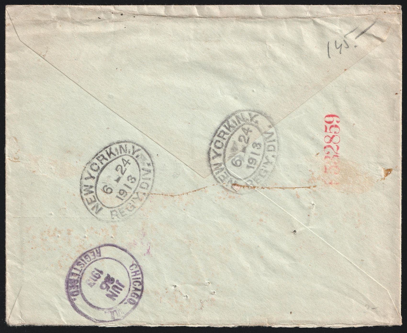 1624 image1913 (10 Jun) Republic of Colombia, Registered Commercial Cover via New York (United States) to Chicago (United States), franked with 5c and 10c, with Blue and Violet Commercialandstamp's. Creases and pinholes. | Michel 223, 226 (Image 1) (Image 2)
