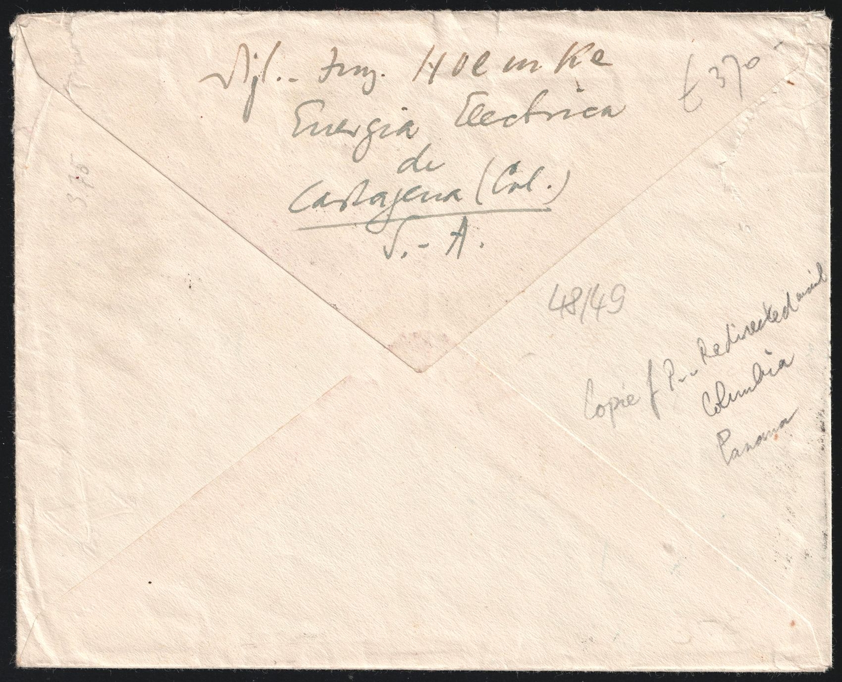 1625 image1930 (24 Nov) Republica of Colombia, International Airmail Cover from Cartagena (Colombia) via New York (United States) to Berlin (Germany), franked with 2 x 4c, 10c and Airmail 10c, 15c and Canal Zone 20c on 2c (tied by Oval Numeral '1' Postmark). Light creases and small tear at the top. | Michel 298, 47, 48, 83 (Image 1) (Image 2)