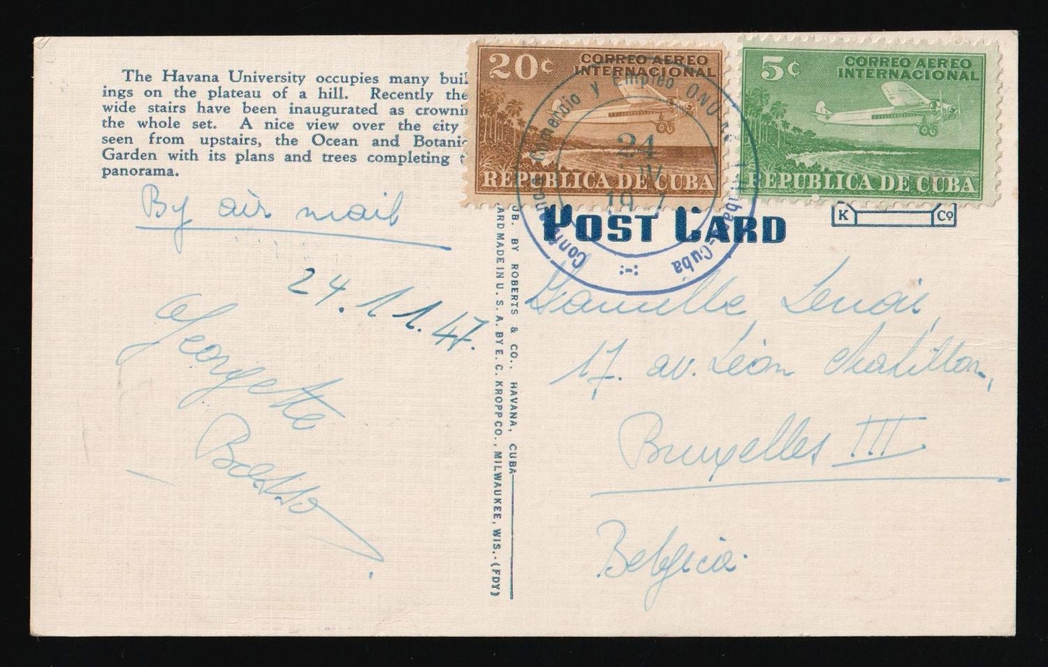 1618 image1947 (24 Nov) 'United Nations Conference on Trade and Employment (UNCTE) in Havana, Cuba', Republic of Cuba, Airmail Postcard from Havana (Cuba) to Brussels (Belgium) franked with 5c, 20c. | Michel 80, 83 (Image 1) (Image 2)