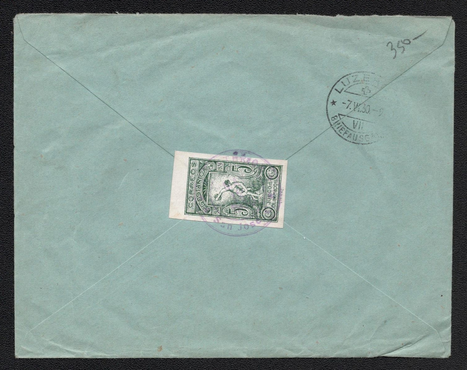 1628 image1930 (12 May) Costa Rica Registered Cover from San Jose (Costa Rica) to Lucerne (Switzerland), franked with 5c, tete-behe of 20c, Imperforate 5c on the back side. | Michel 127B, 129A, 145 (Image 1) (Image 2)