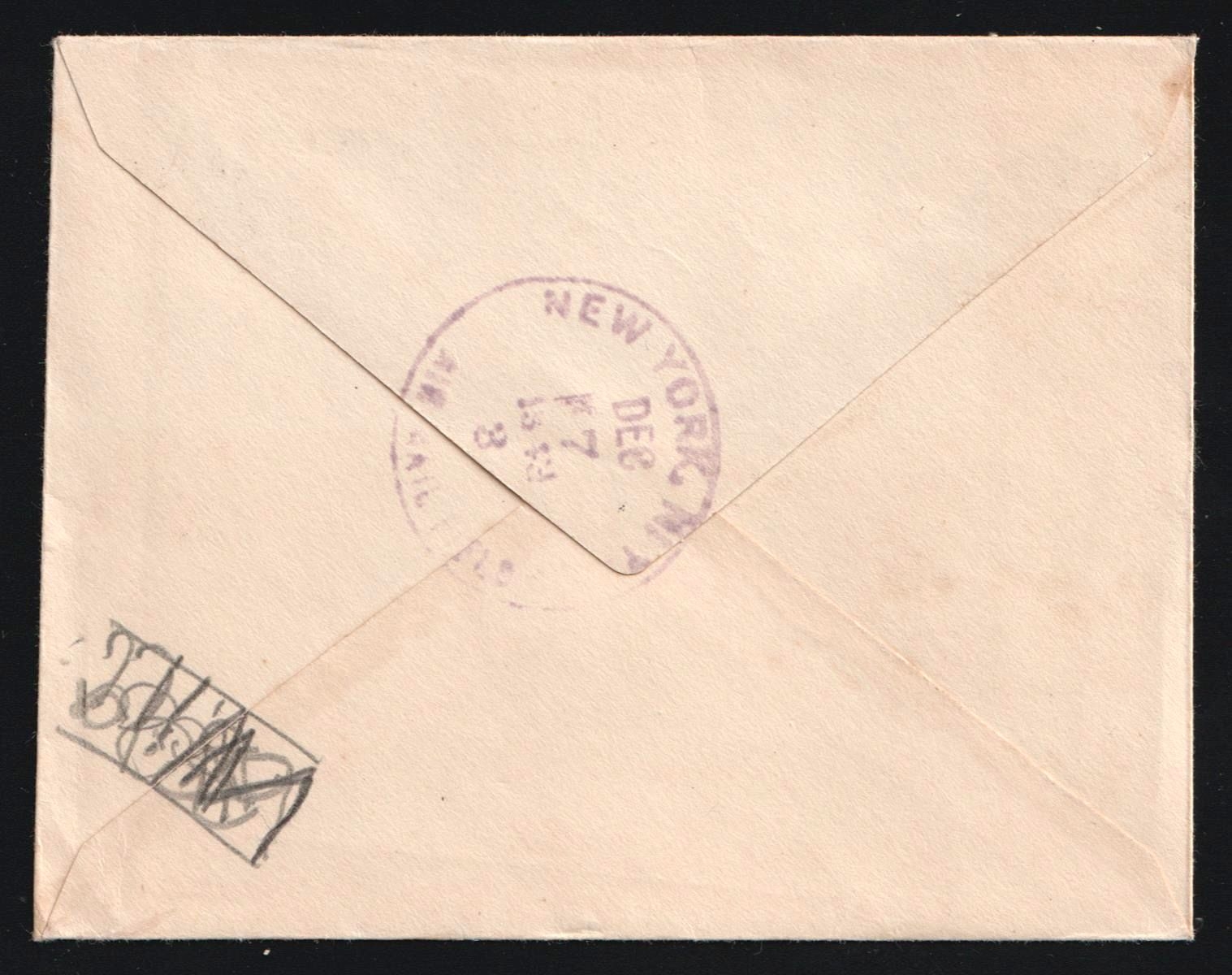 1745 Used image1949 (Nov. 30) Ceylon: Underpaid Airmail cover to USA franked with two Colonial 50c KGVI singles and Independent Ceylon 25c UPU single all tied by 'Colombo' postmarks with "T/FS' postage due circular cachet alongside. US 3c Postage Due single & 5c pair tied by double-ovals with violet 'New York NY/Airmail Field' backstamp. Used | Scott 286, 306, J82-3 (Image 1) (Image 2)