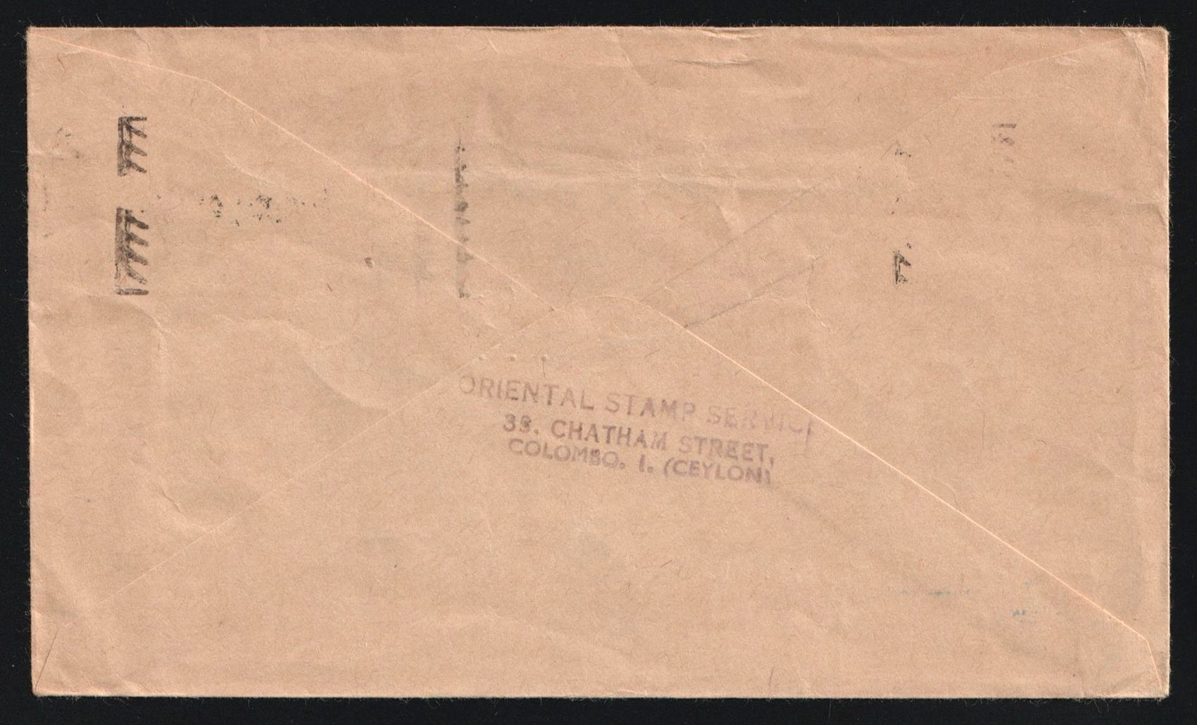 1746 Used image957 (Dec. 26) Ceylon: Unsealed Printed Matter cover to USA (5c rate) franked with 5c Kiri Vahera tied by 'Colombo' duplex. Used | Scott 308 (Image 1) (Image 2)