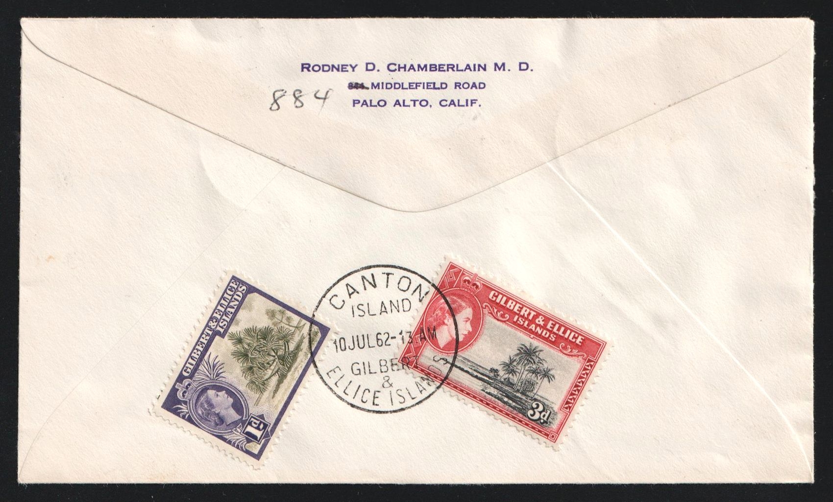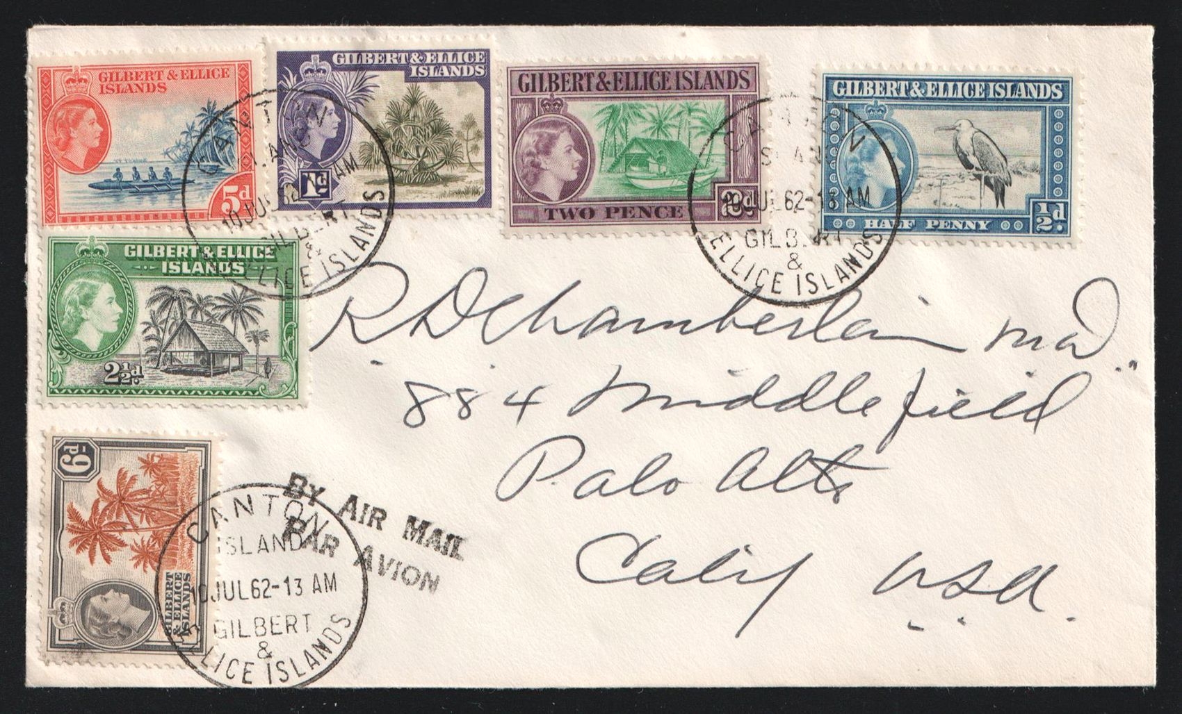 1748 Used imageGilbert & Ellice Islands: 1962 (July 10) Airmail cover to USA franked with eight different QEII stamps (two on reverse) all tied by 'Canton Island' postmarks. Used (Image 1) (Image 2)