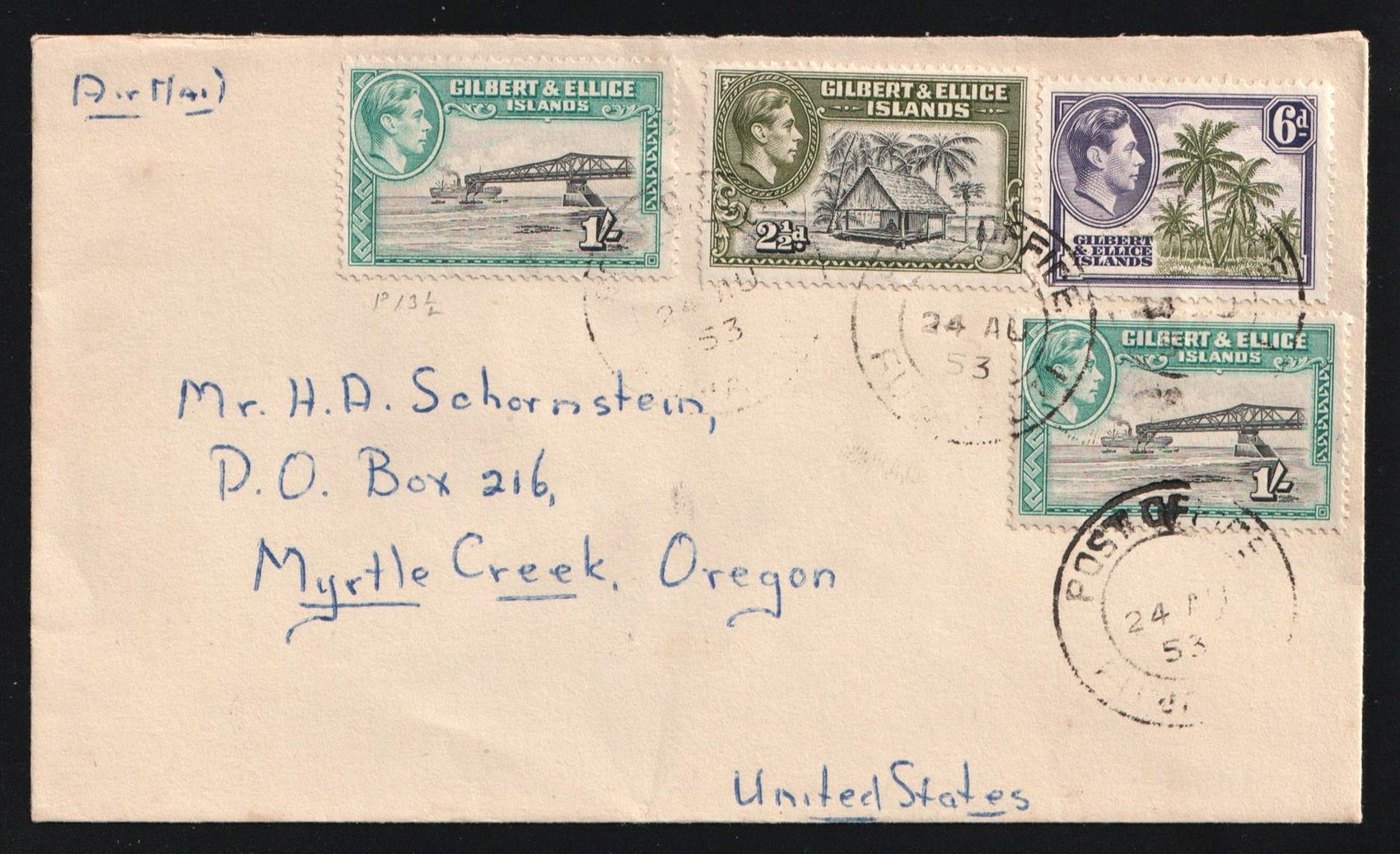 1747 Used imageGilbert & Ellice Islands (Tuvalu): 1953 (Aug. 24) Double-Weight Airmail cover to USA franked with four KGVI issues tied by 'Post Office Funafuti' postmarks. Used (Image 1) (Image 2)