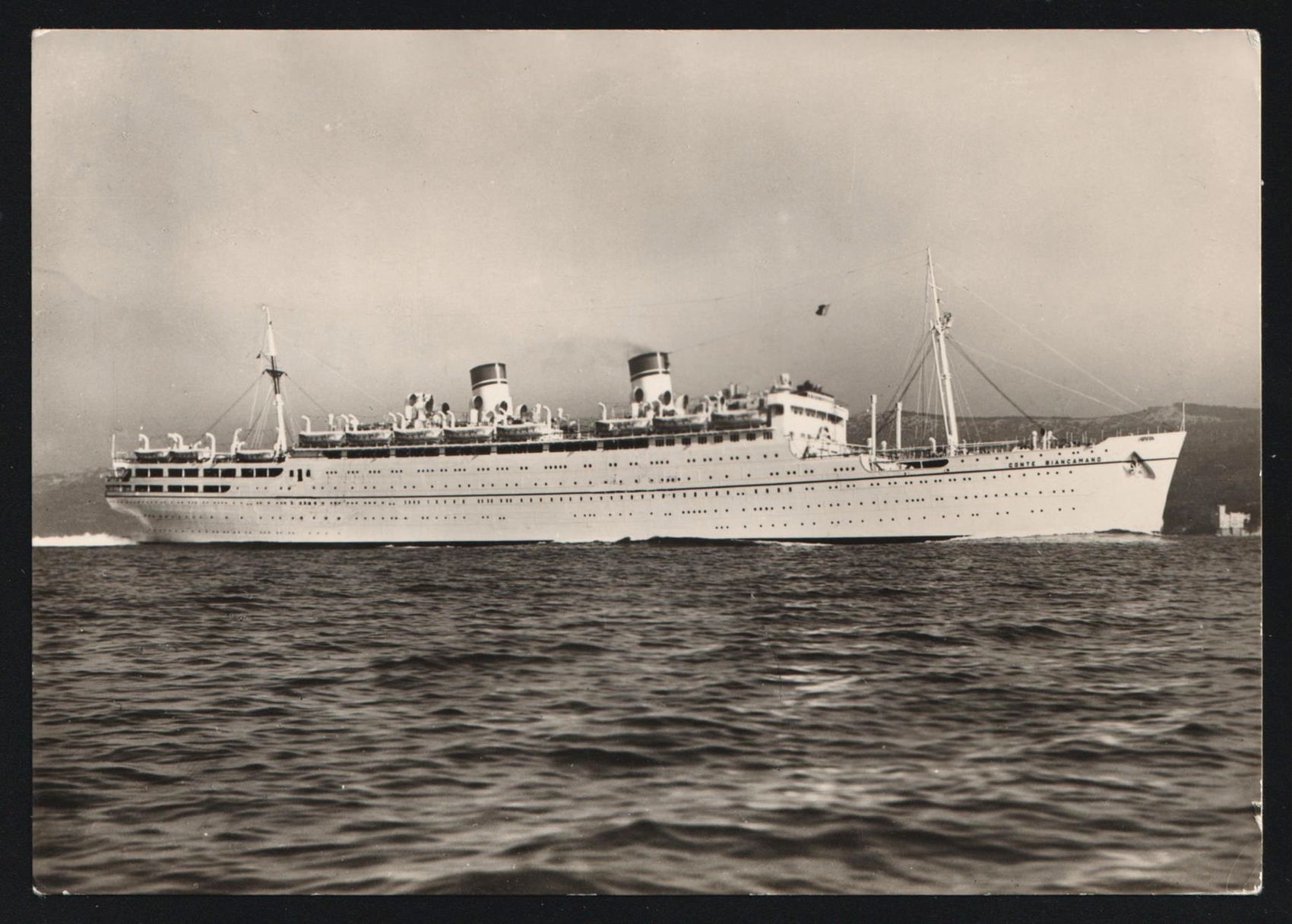 1749 Used image1950 (March 29) Gibraltar: Italian Ship 'Conte Biancamano' picture postcard to USA franked with Gibraltar 2d KGVI tied by 'Gibraltar' postmark. Used | Scott 110B (Image 1) (Image 2)