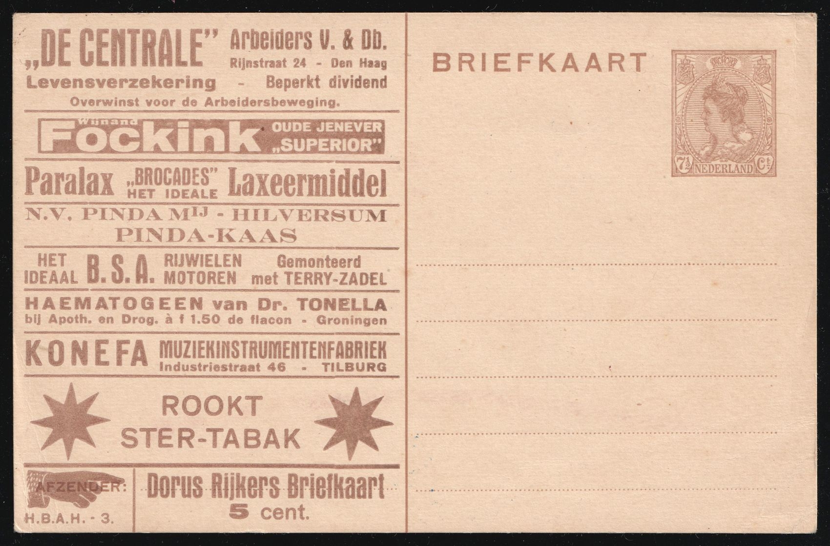 1926-27 Netherlands, 7,5с Postal Stationery Card with Advertisements from Local Commercial Association 'The