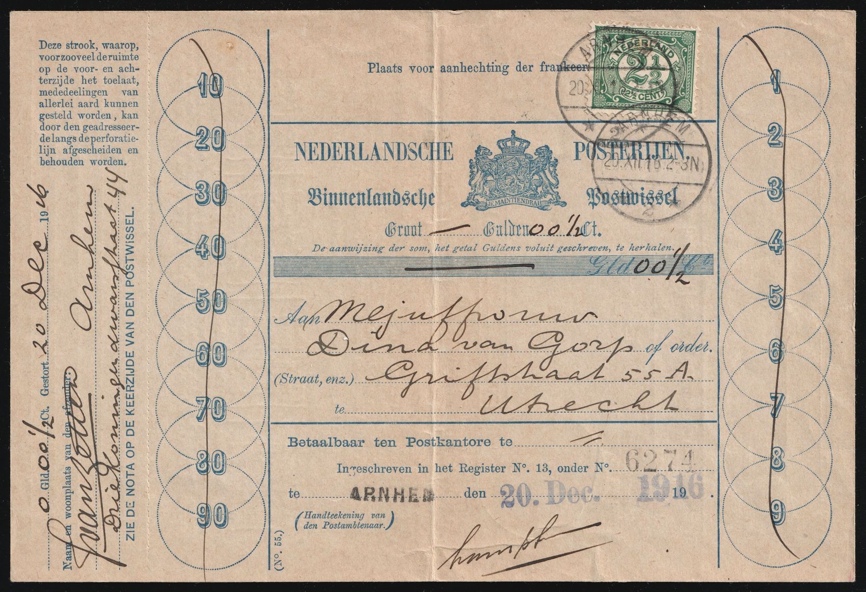 1916 (20 Dec) Netherlands, Domestic Postal Transfer from Arnhem to Utrecht franked with 2.5c. | Michel 52 (Image 1)