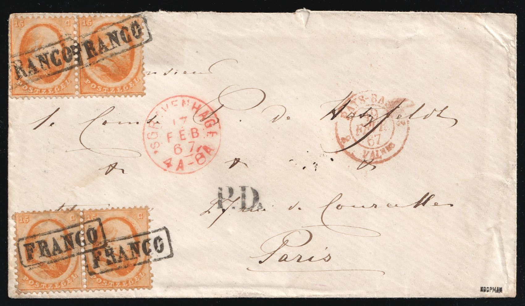 1867 (17 Feb) Netherlands, Cover from Hague to Paris with Wax Seal franked with pairs of 15c, Signed. | Michel