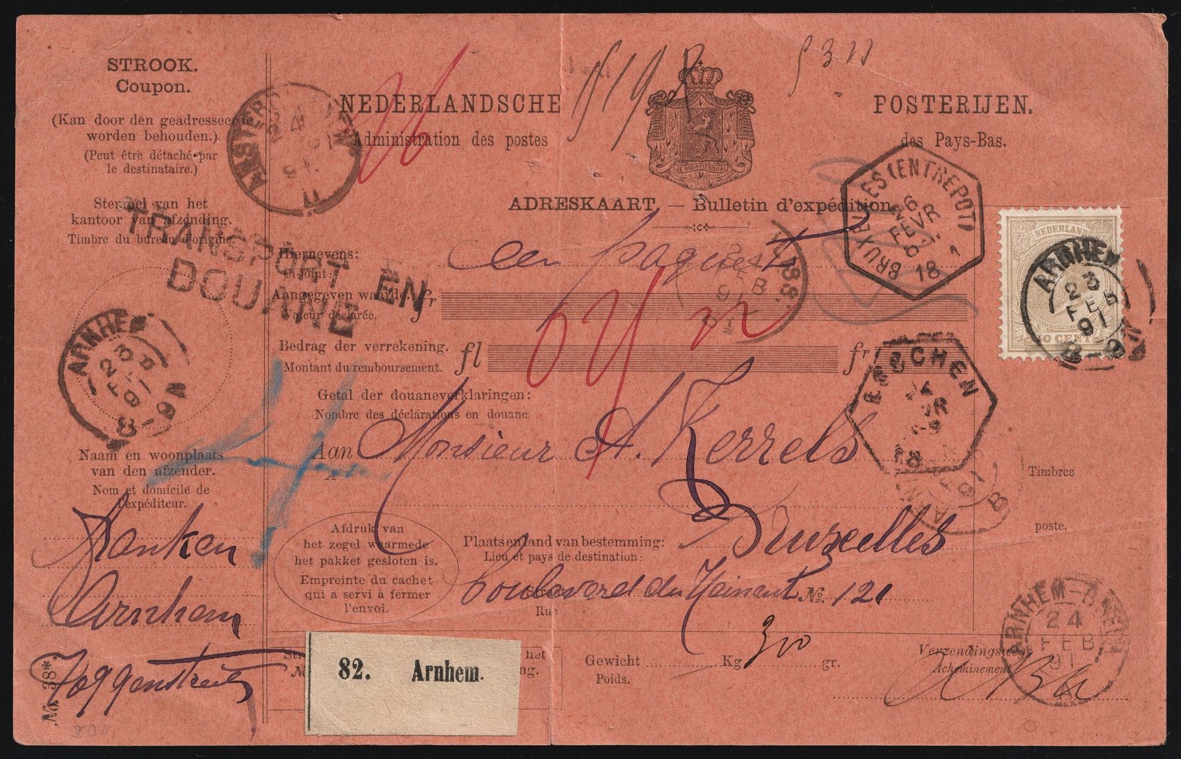 1891 (23 Feb) Netherlands, Registered International Parcel Dispatch Note from Arnhem to City of Brussels