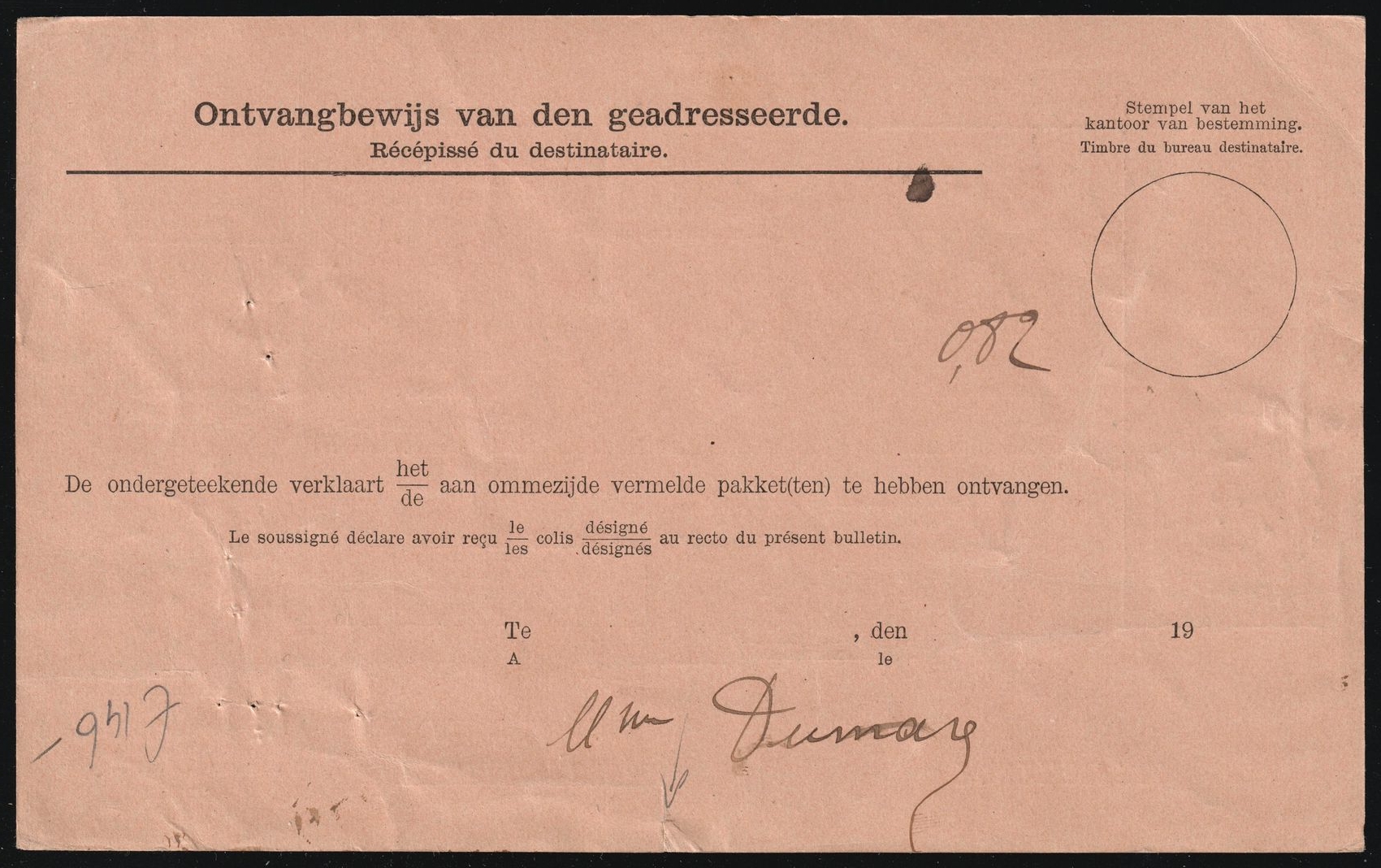 1912 (24 Aug) Netherlands, Registered International Parcel Dispatch Note from Amsterdam to City of Brussels