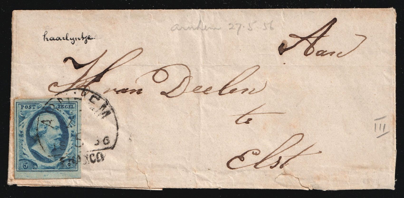 1856 (27 May) Netherlands, Cover from Arnhem to Elst franked with 5c. | Michel 1 (Image 1)