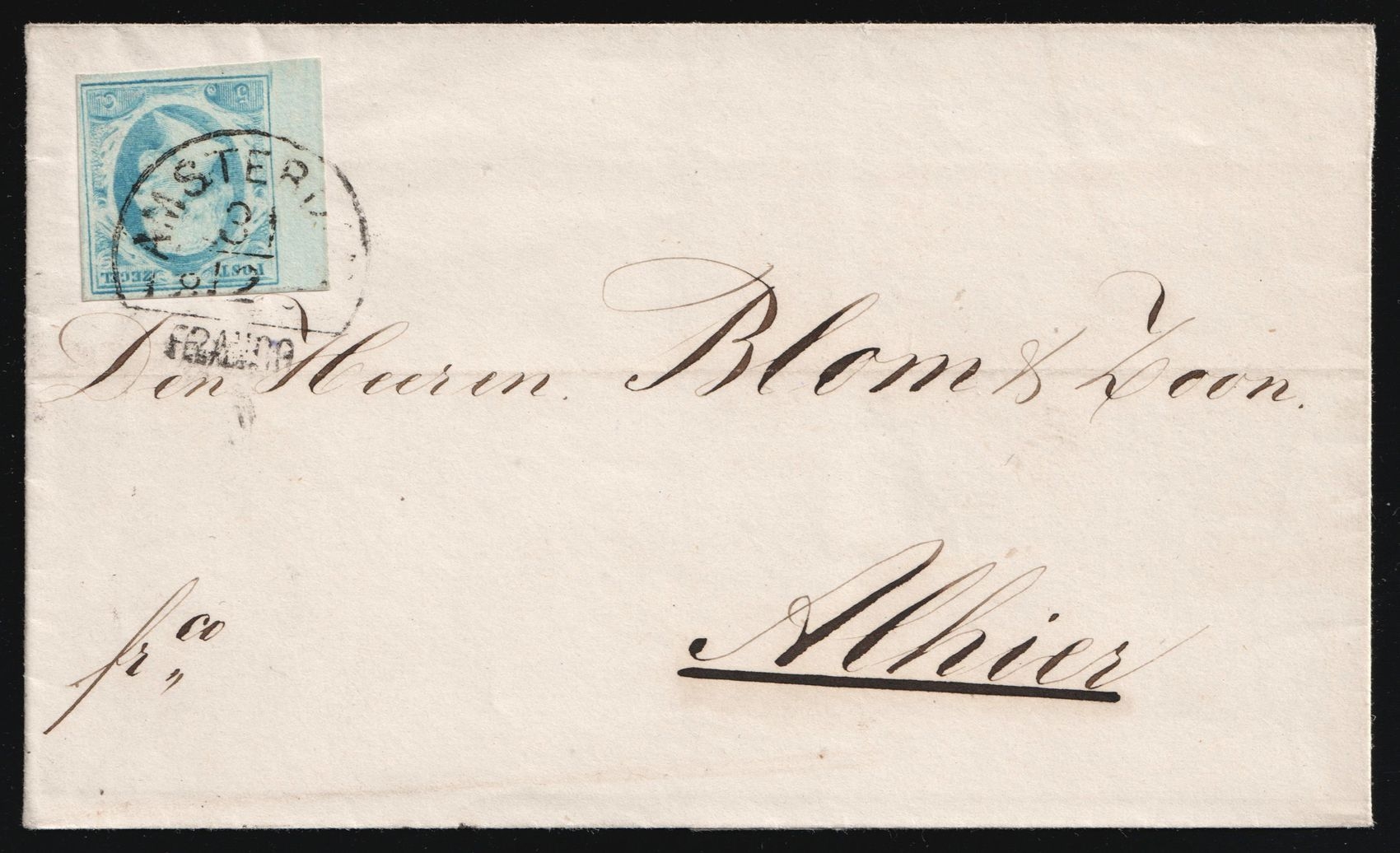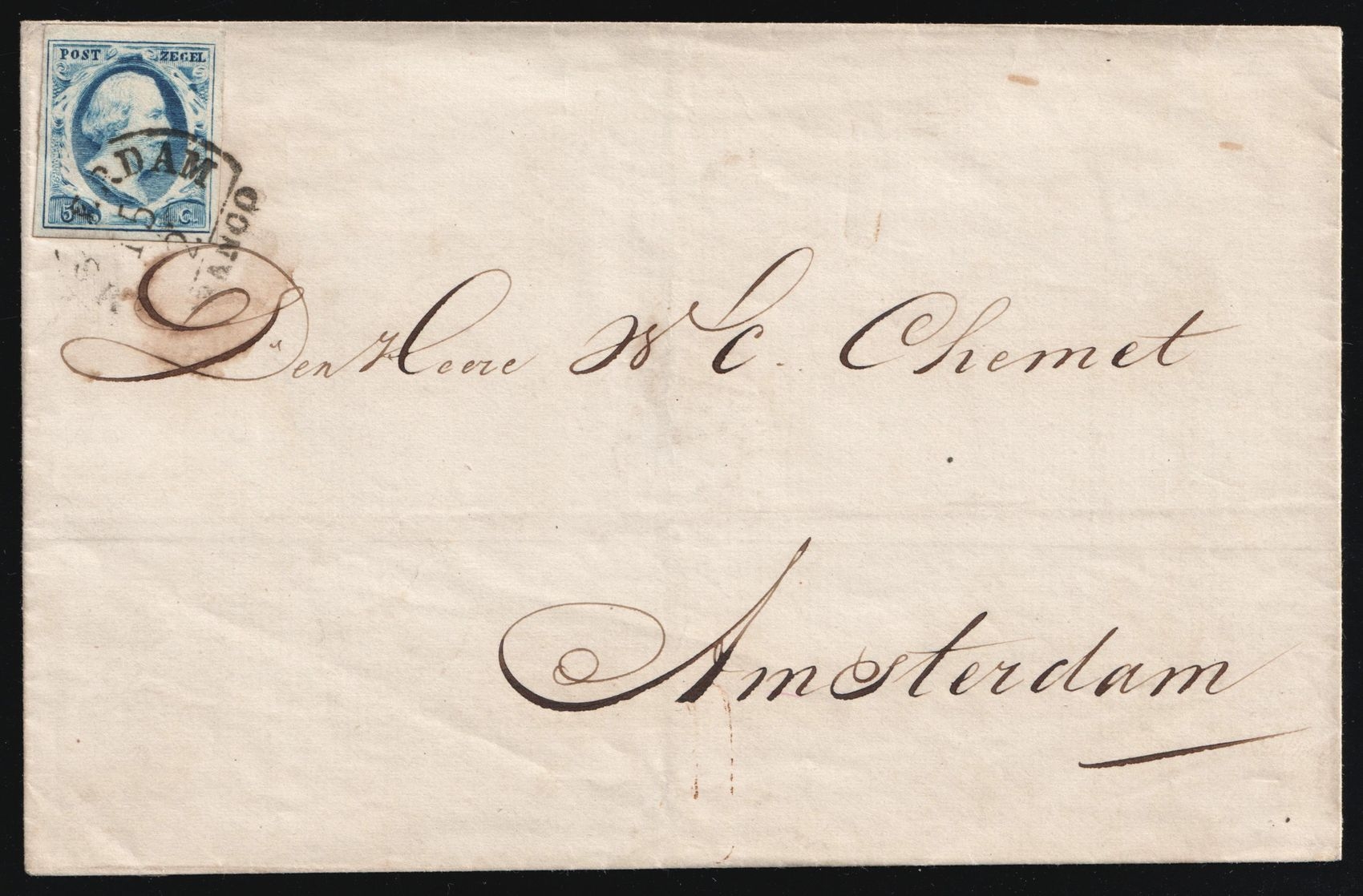 185_ (31 Dec) Netherlands, Cover locally addressed in Amsterdam franked with 5c, Margin. | Michel 1 (Image 1)