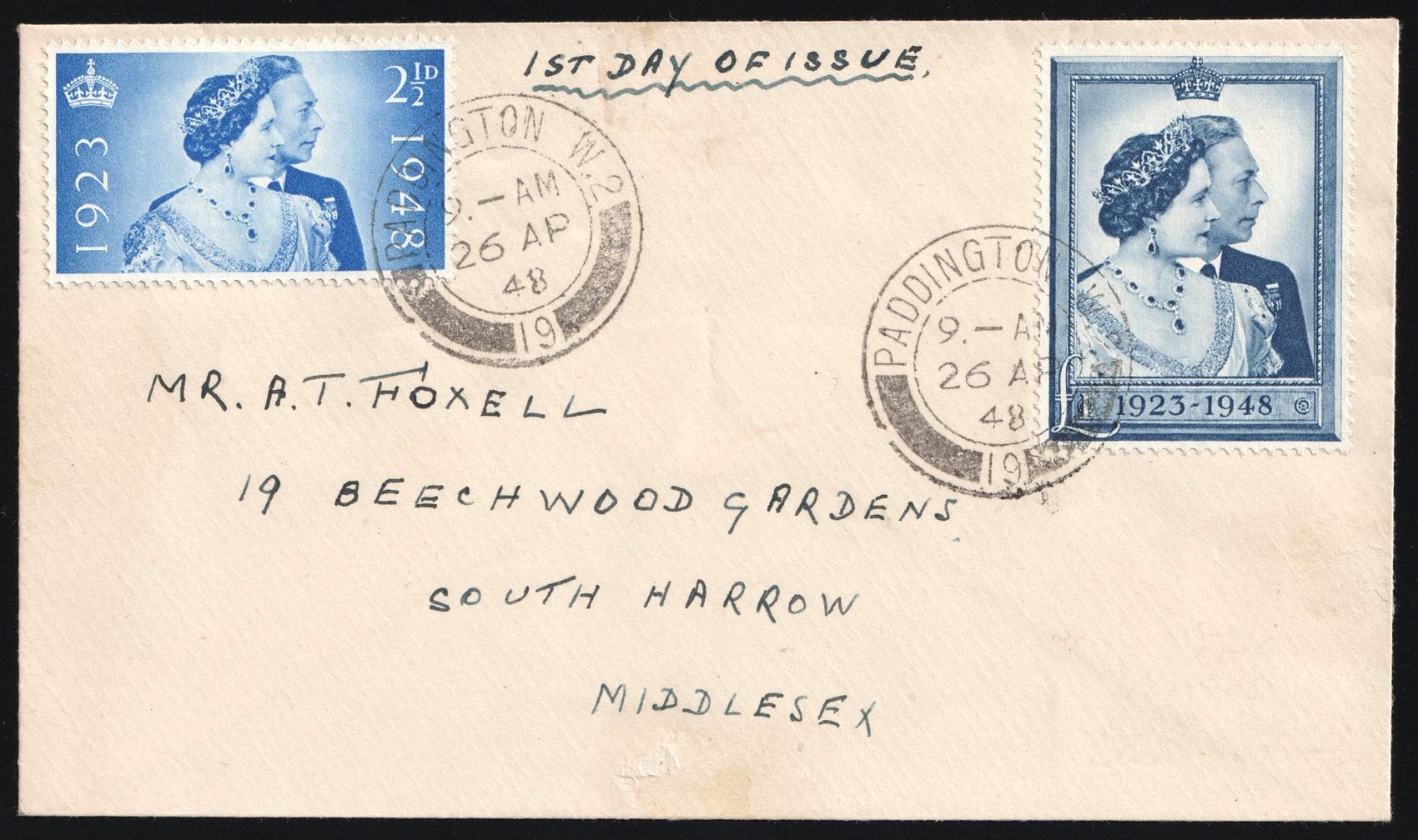2099 image1948 (26 Apr) Great Britain, First Day Cancellation, FDC London (England) locally addressed Cover from Paddington (district of London) to South Harrow (district of London), franked with Complete Set 2.5d and 1f. Small thin spot on the frontside. | Stanley Gibbons 493 - 494 (Image 1) (Image 2)