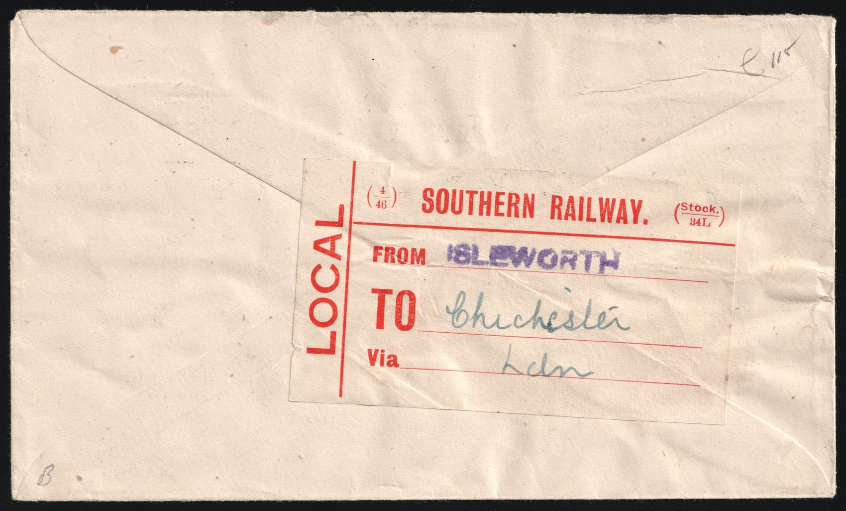 2097 image1946 (10 Aug) 1d Great Britain, Railway Cover from Isleworth (England) via London (England) to Chichester (Selsey, Sussex, England) by Local Southern Railway '230' Wagon, franked with 1/2d and 2d. Creases. | Stanley Gibbons 462, 465 (Image 1) (Image 2)