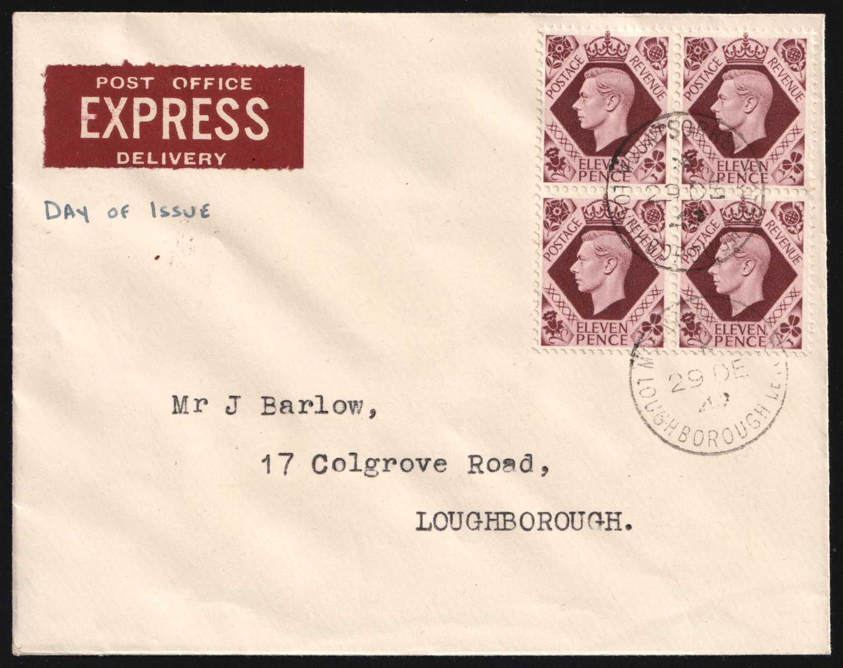 2098 image1947 (29 Dec) Great Britain, Cover from Mountsorrel (England) to Loughborough (England), franked with First Day of Issue FDC Block of Four 11d. Light creases. | Stanley Gibbons 474a (Image 1) (Image 2)