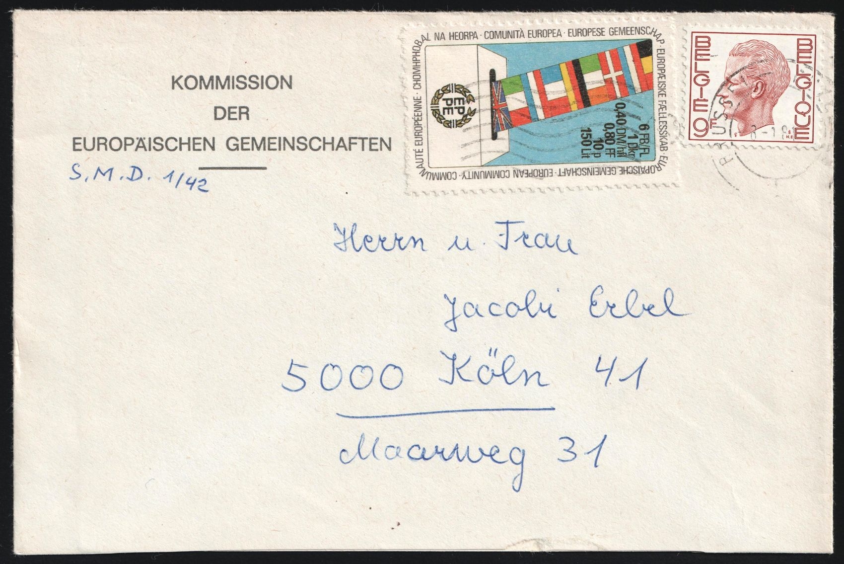 2061 image1981 (8 Jan) Belgium, 'Commission of European Parliament', Cover from Brussels (Belgium) to Cologne (Germany), franked with 9f and Stamp Issued for European Parliament. | Michel 2014 (Image 1) (Image 2)