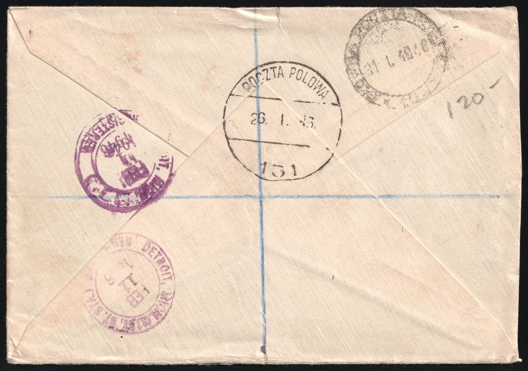 2096 image1946 (26 Jan) Great Britain, Registered Airmail Military Field Post Cover to Detroit (United States), franked with 3d and 10d. Light creases and small tears. | Stanley Gibbons 467, 474 (Image 1) (Image 2)